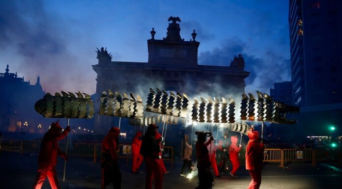 -Las calles valencianas se llenan de pirotécnicos, actores y figurantes que simulan ser demonios y personajes distópicos mientras lanzan fuegos al aire de la ciudad