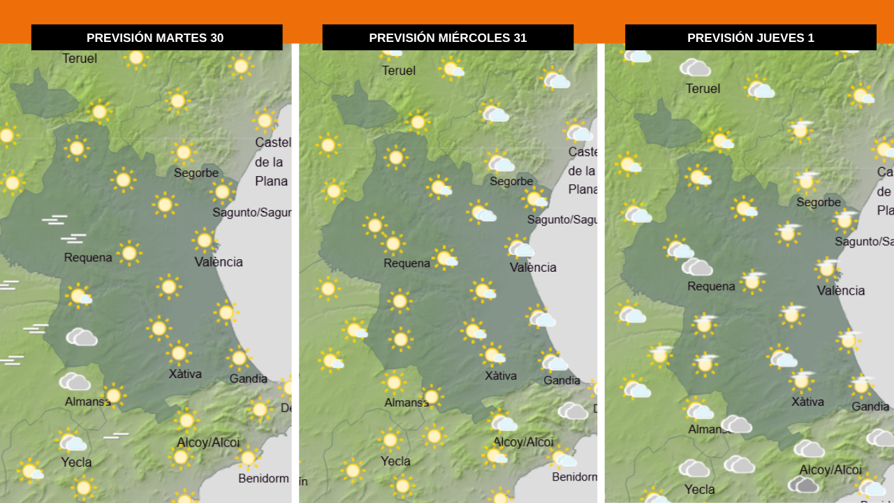 Para este martes no se esperan precipitaciones, una situación de estabilidad que se prolongará al miércoles dejando una Nochevieja que, a diferencia del pasado año, podría dejar una celebración tranquila y libre de paraguas. Pese a que no habrá lluvia, sí se prevé una noche especialmente fría. Según los avances de AEMET, las mínimas podrían rondar los 5-8º en el litoral valenciano y los 0-4º en puntos del interior de la provincia.
