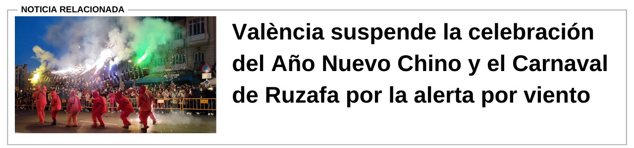 El temporal ya ha provocado la suspensión de actos al aire libre, como la celebración del Año Nuevo Chino en València, y la cancelación de todos los partidos de fútbol previstos el sábado en la Comunitat Valenciana. A partir de la medianoche del domingo, el aviso descenderá a nivel amarillo, aunque todavía podrían registrarse rachas superiores a los 80 km/h.