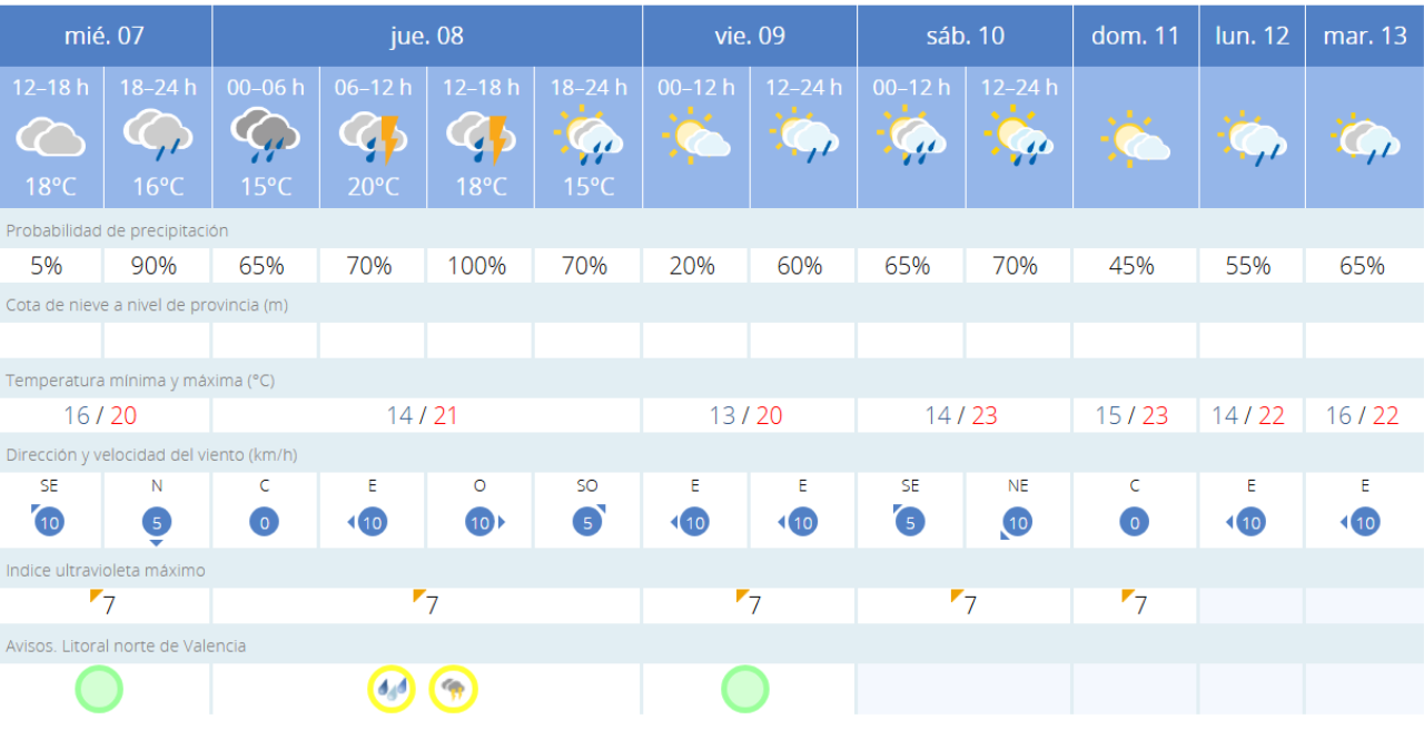 Según el pronóstico de AEMET, a partir de las 12:00 y hasta las 21:59 horas, se espera el desarrollo de chubascos generalizados, especialmente durante la tarde, cuando podrían alcanzar intensidad fuerte o muy fuerte. Las precipitaciones estarán acompañadas de tormentas y granizo, afectando tanto al interior como al litoral de la provincia de Valencia, así como a áreas de Alicante y Castellón.