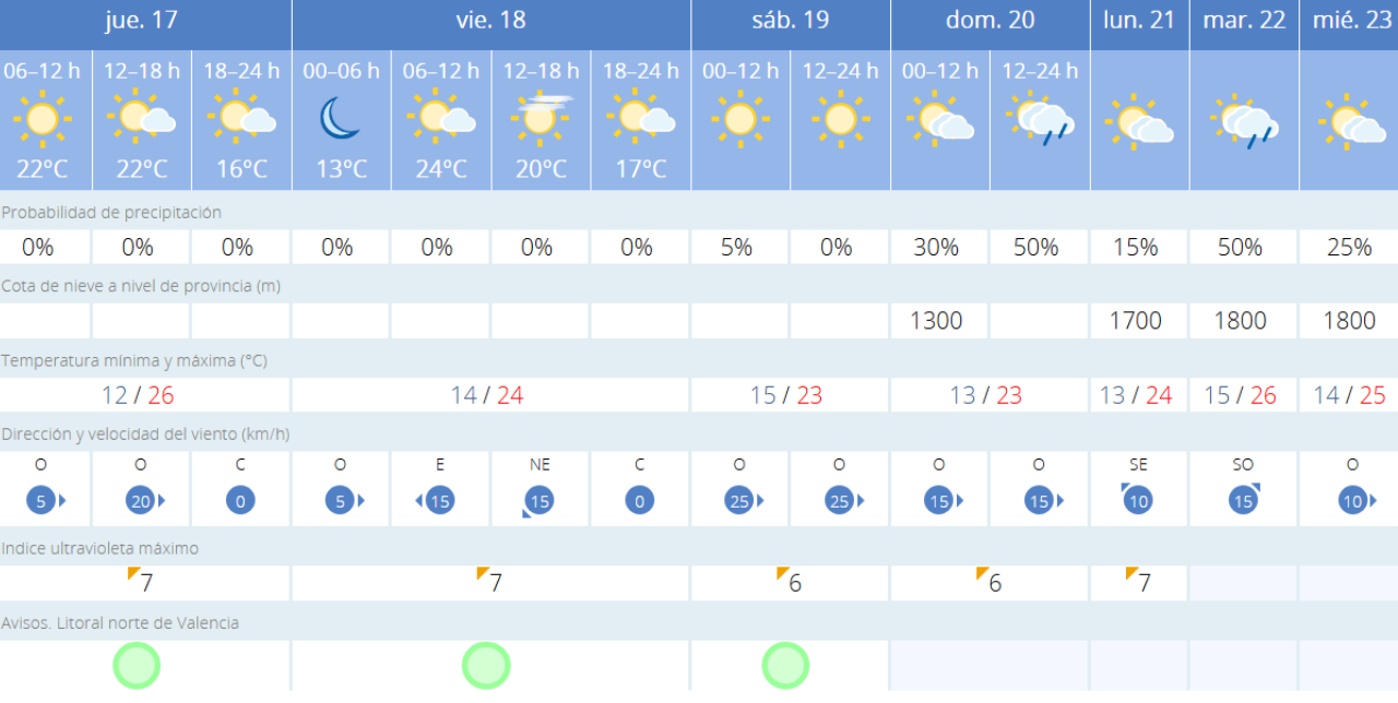 «Hoy y mañana serán días cálidos, superando los 25°C en localidades del litoral y prelitoral de Valencia, Alicante y sur de Castelló. Estos días cálidos, con viento de poniente, aunque no tan fuerte como ayer o el sábado, el riesgo de incendios forestales es alto. Atención a las normas y consejos del 112 con días de riesgo alto de incendios», señalan desde AEMET.