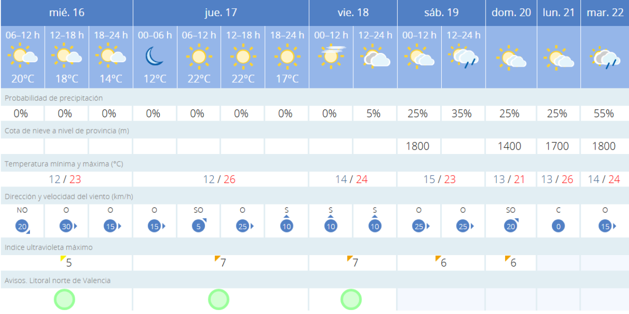 A partir del sábado, se prevé la llegada de un frente más activo que dejará precipitaciones en la mitad norte de Castellón, con posibles lluvias más dispersas en el resto de la región. La cota de nieve descenderá hasta los 1100-1300 metros al final del día, lo que podría suponer la primera nevada primaveral en cotas medias. Además, no se descartan lluvias escasas en la ciudad de Valencia en las horas centrales del día.