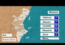El cel de la Comunitat Valenciana estarà el dimecres nuvolós, amb baixa probabilitat de precipitacions febles al final del dia, el vent serà fluix, de component oest a València i Alacant i variable a Castelló, les temperatures a penes variaran i es produiran gelades febles en zones altes de l’interior de Castelló.
