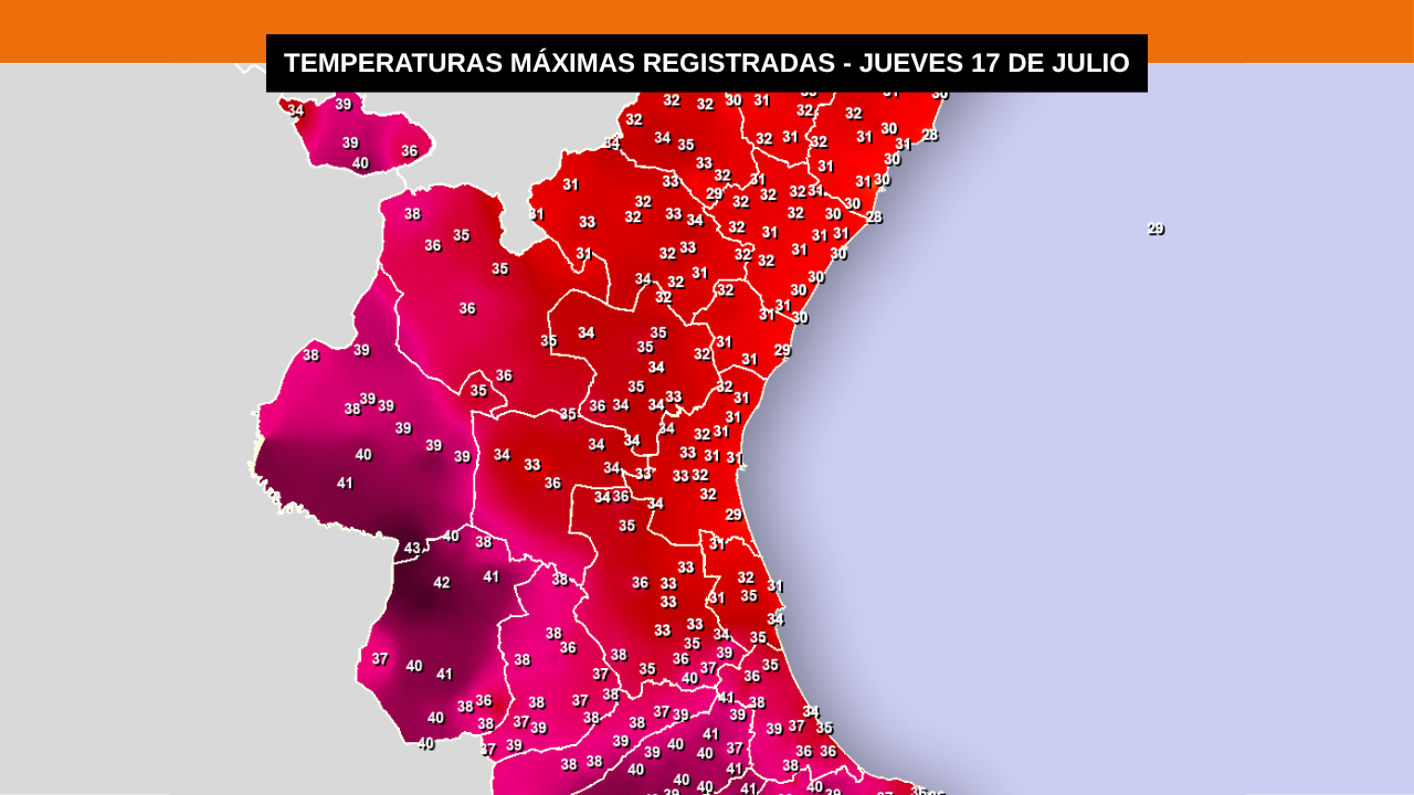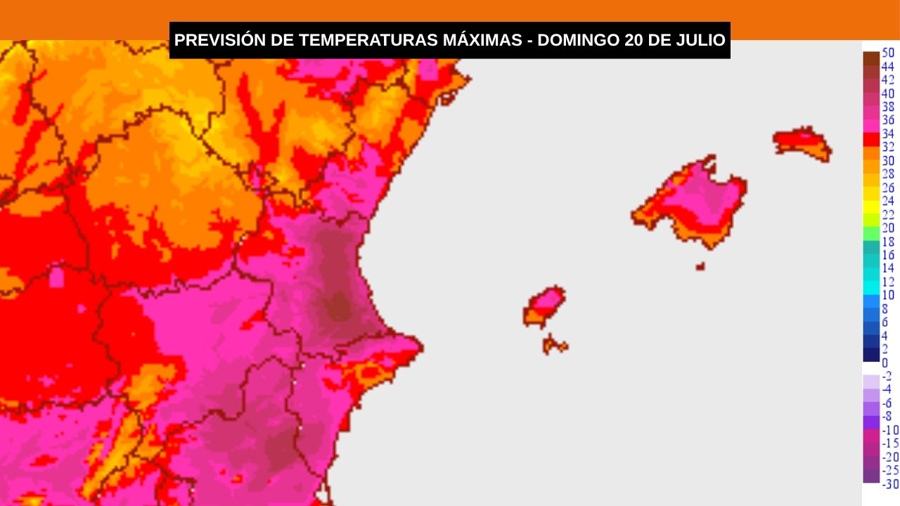 Este fenómeno ha llevado a la Aemet a decretar avisos naranja por altas temperaturas en la provincia de Valencia y amarillo en Alicante. Se prevén máximas de hasta 40 grados este viernes, especialmente en el interior sur de Valencia, y valores de hasta 42 grados en Xàtiva el sábado. En Valencia capital, en pleno litoral, el termómetro podría alcanzar los 39 grados el domingo. Las mínimas no bajarán de los 25 grados, dando lugar a noches tórridas en gran parte del territorio.