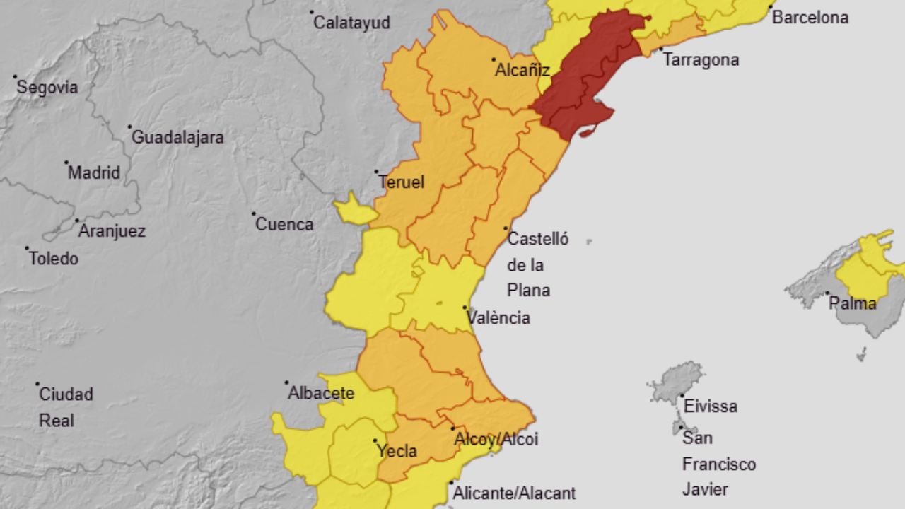 La Conselleria de Emergencias e Interior, a través del Centro de Coordinación de Emergencias (CCE) de la Generalitat, ha ampliado la alerta naranja por lluvias y tormentas al interior norte de Alicante y mantiene el aviso en toda la provincia de Castellón, en el interior sur y litoral sur de Valencia y en el litoral norte de Alicante. La medida entra en vigor este lunes a las 12.00 horas y se prolongará hasta la medianoche, con la posibilidad de que el nivel de riesgo aumente en el norte de Castellón durante la mañana.