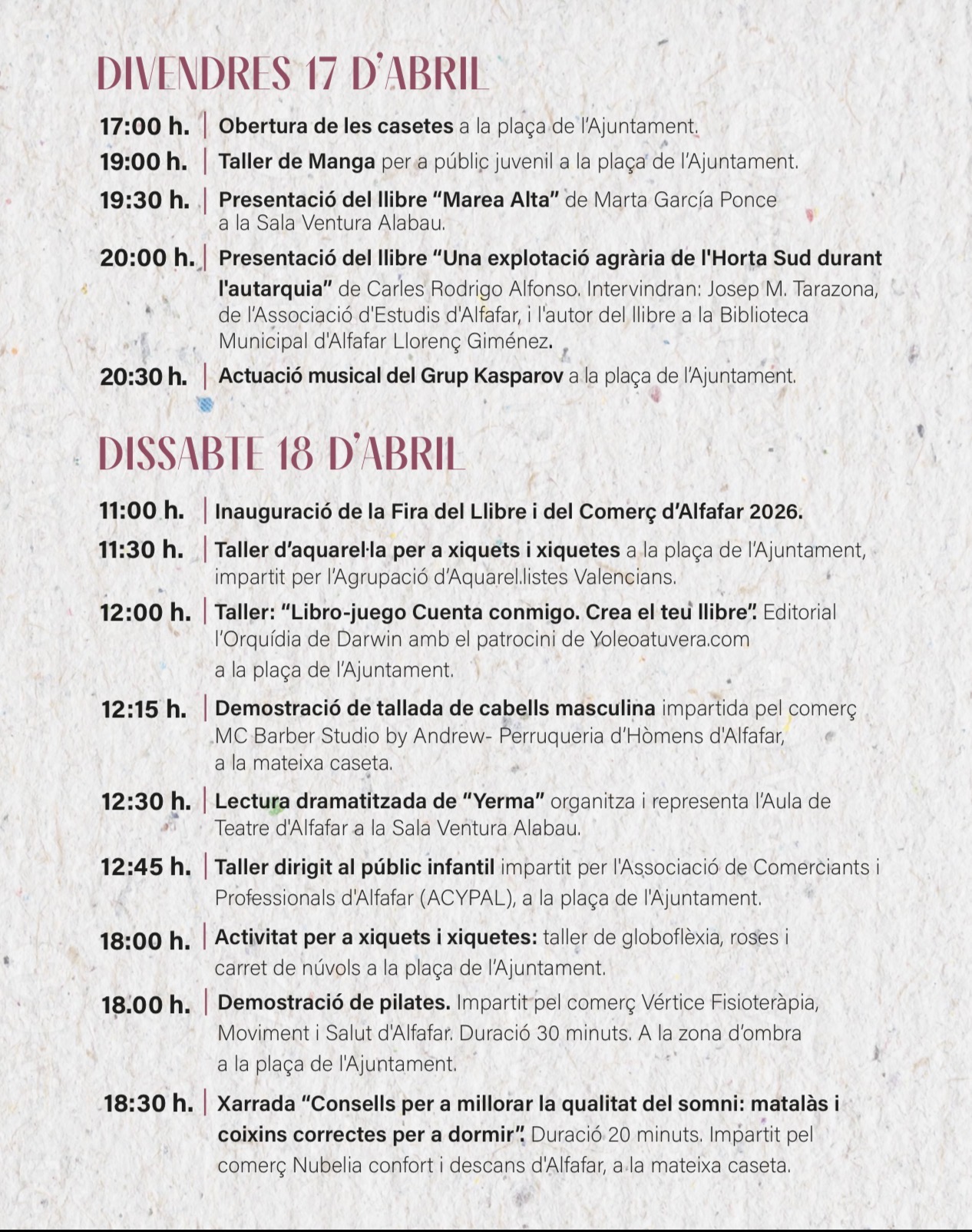 El dissabte 18 d’abril tindrà lloc la inauguració oficial de la Fira del Llibre i del Comerç d’Alfafar 2026 a les 11.00 hores, amb activitats familiars i infantils com tallers d’aquarel·la, propostes creatives vinculades al llibre-joc “Cuenta conmigo. Crea el teu llibre”, demostracions del comerç local i la lectura dramatitzada de Yerma a càrrec de l’Aula de Teatre d’Alfafar.
