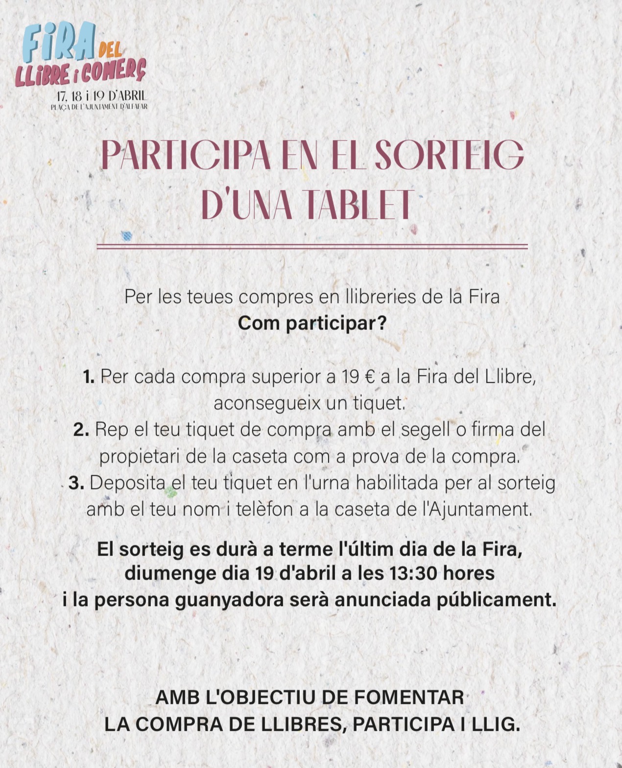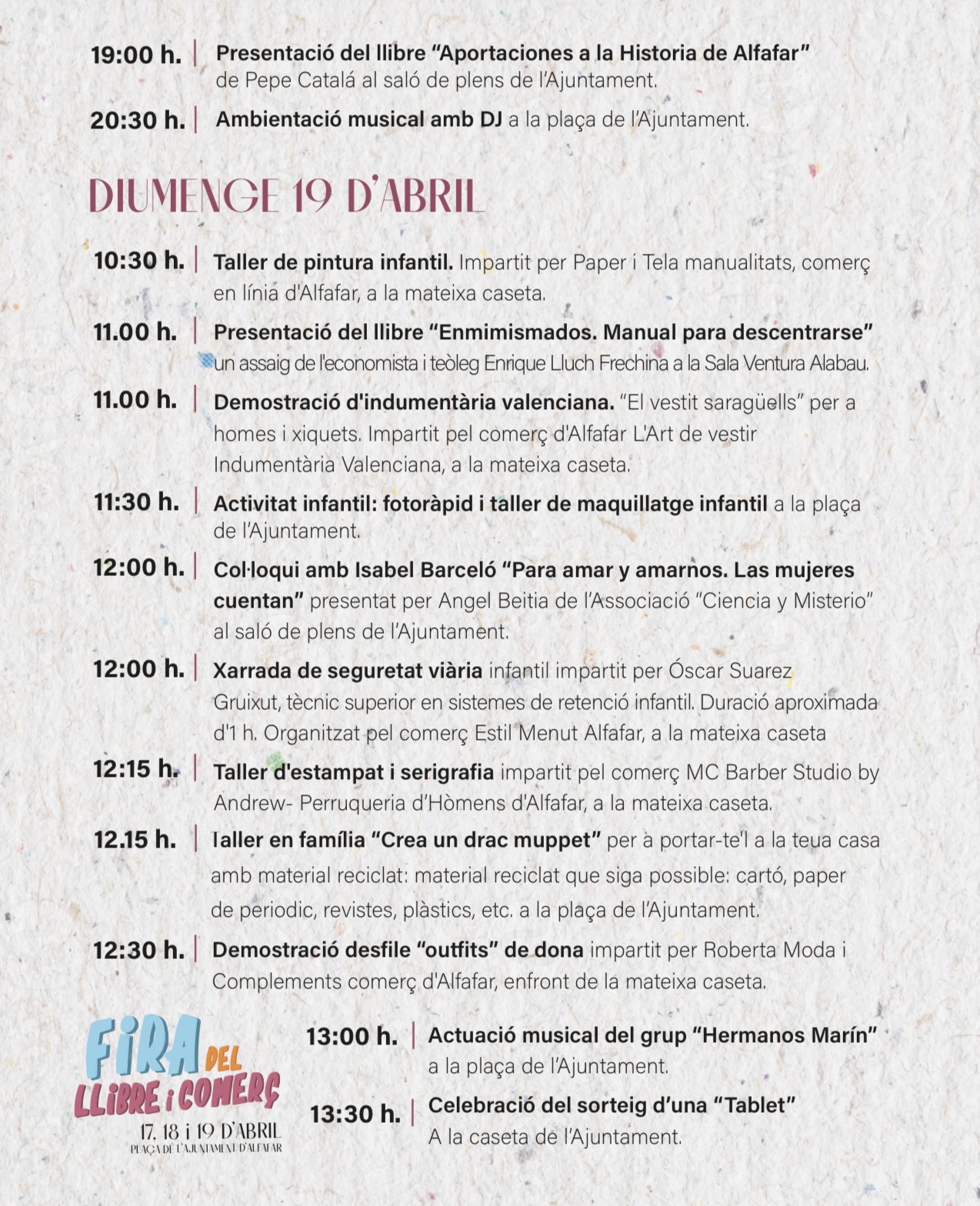 El diumenge 19 d’abril continuarà la programació amb tallers infantils, activitats creatives amb materials reciclats, demostracions d’indumentària valenciana, estampació i serigrafia, així com trobades literàries i actuacions musicals. La jornada finalitzarà amb el sorteig d’una tauleta digital a les 13.30 hores per compres superiors a 19 euros en les llibreries participants.