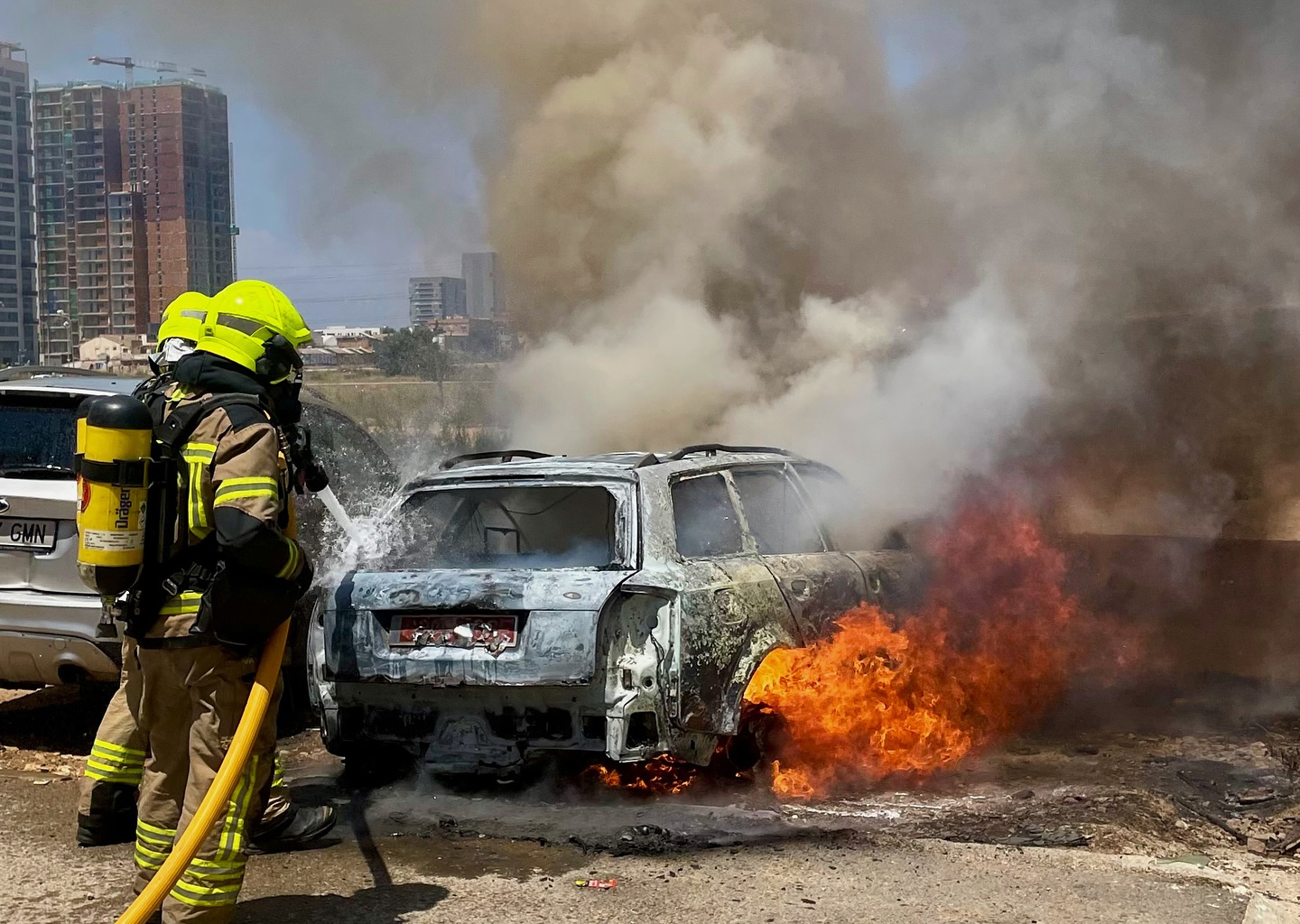 Los bomberos apagan el fuego de dos vehículos en un descampado