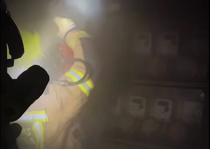 Los bomberos apagan un fuego en el cuarto de contadores de un edificio en la avenida Antiguo Reino. Los agentes, al llegar, encuentran humo en la puerta de una construcción. Rápidamente ubican el foco en el panel de medidores ubicado en el pasillo del mismo edificio.