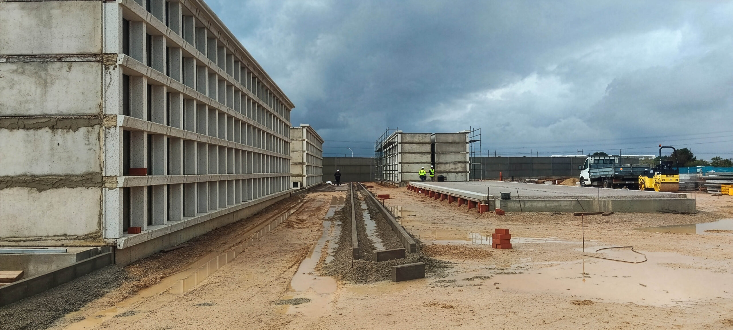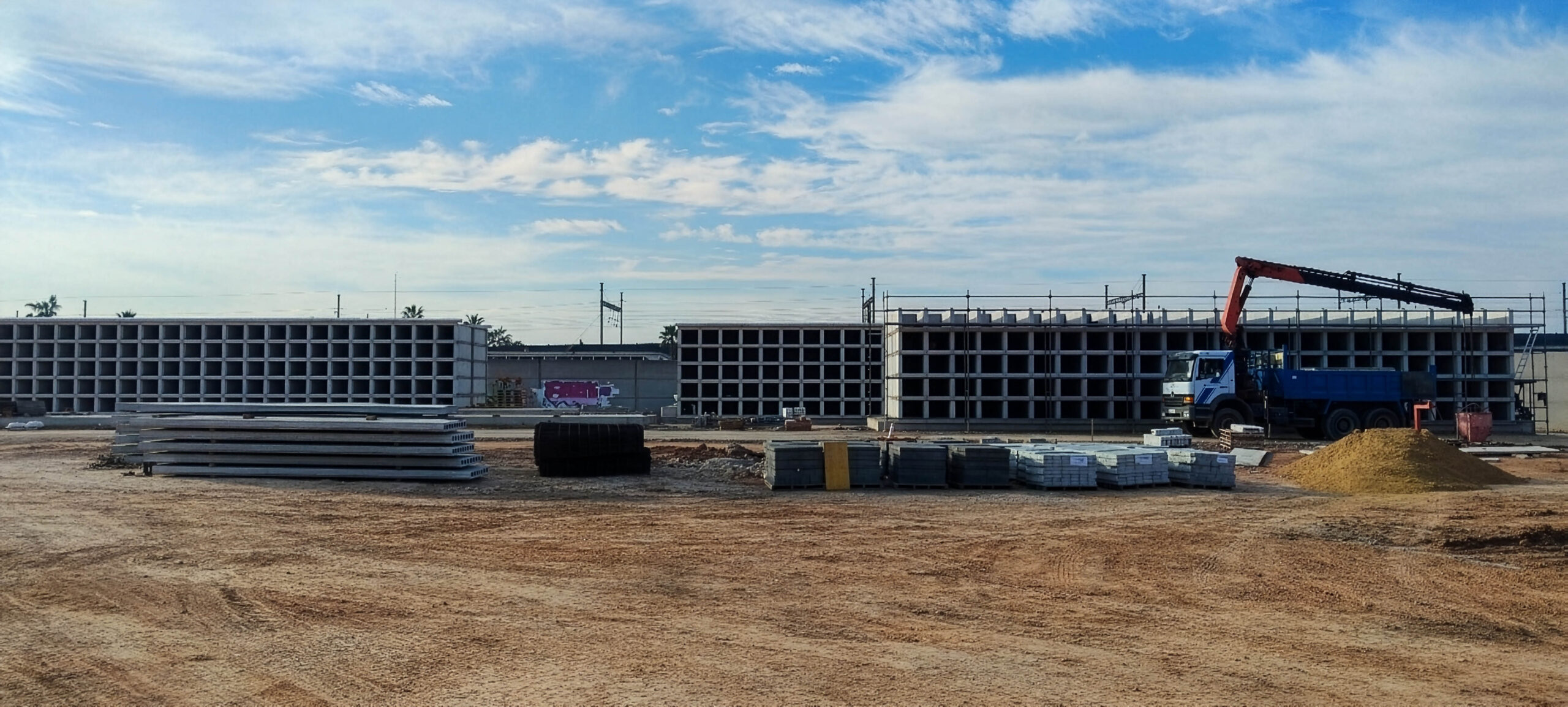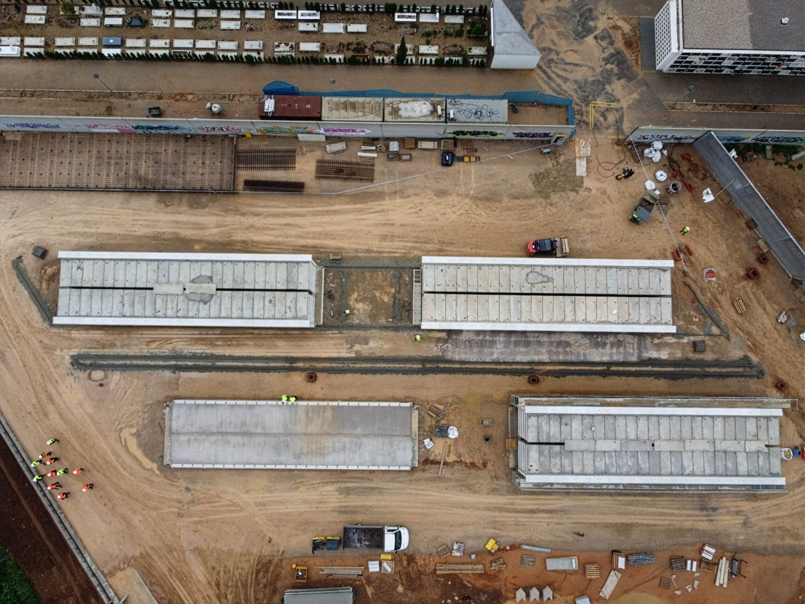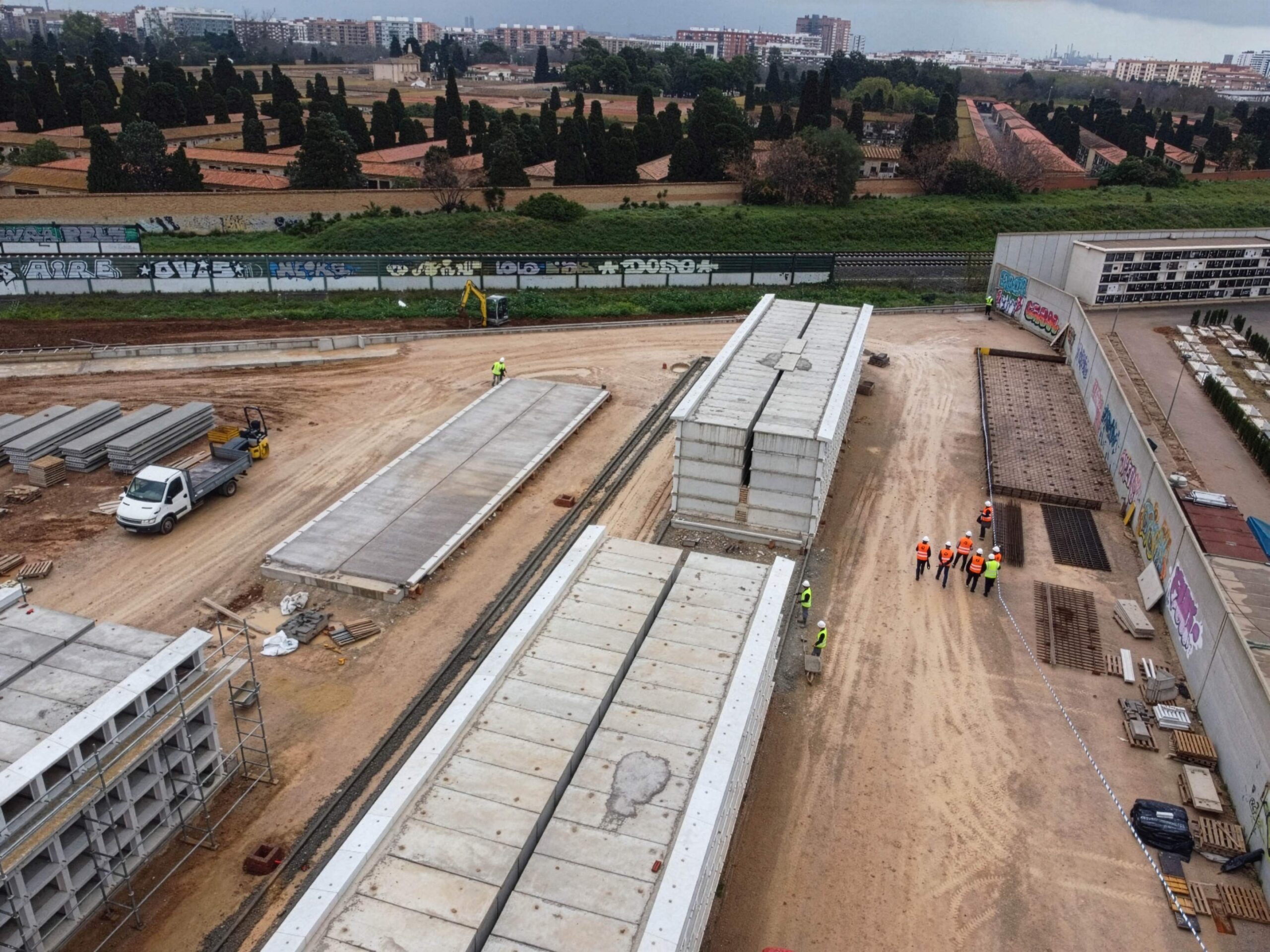 Al mismo tiempo, continúan los trabajos de construcción de los bloques de nichos sencillos, que constituyen el elemento principal de la intervención. En los testeros de estos bloques se adosarán nichos columbarios, optimizando el aprovechamiento del espacio y ampliando la oferta de unidades destinadas al depósito de urnas cinerarias.