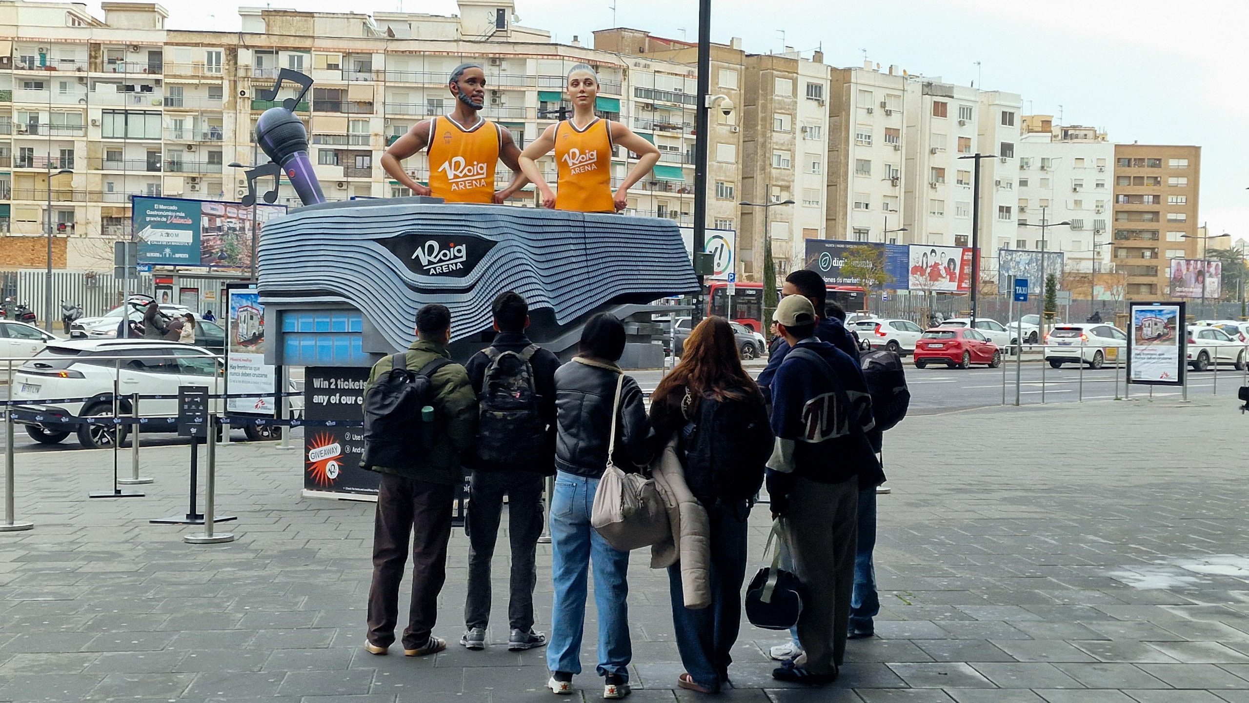 El monumento, un guiño a las Fallas, tiene cuatro metros de profundidad, tres metros de anchura y casi tres metros de altura. Sobre el corpóreo principal (el recinto) se han instalado las piezas superiores, las cuales muestran varios de los contenidos que albergará el arena. Destacan las figuras que representan a dos de los jugadores más reconocidos de los primeros equipos masculino y femenino del Valencia Basket: Raquel Carrera y Jean Montero.