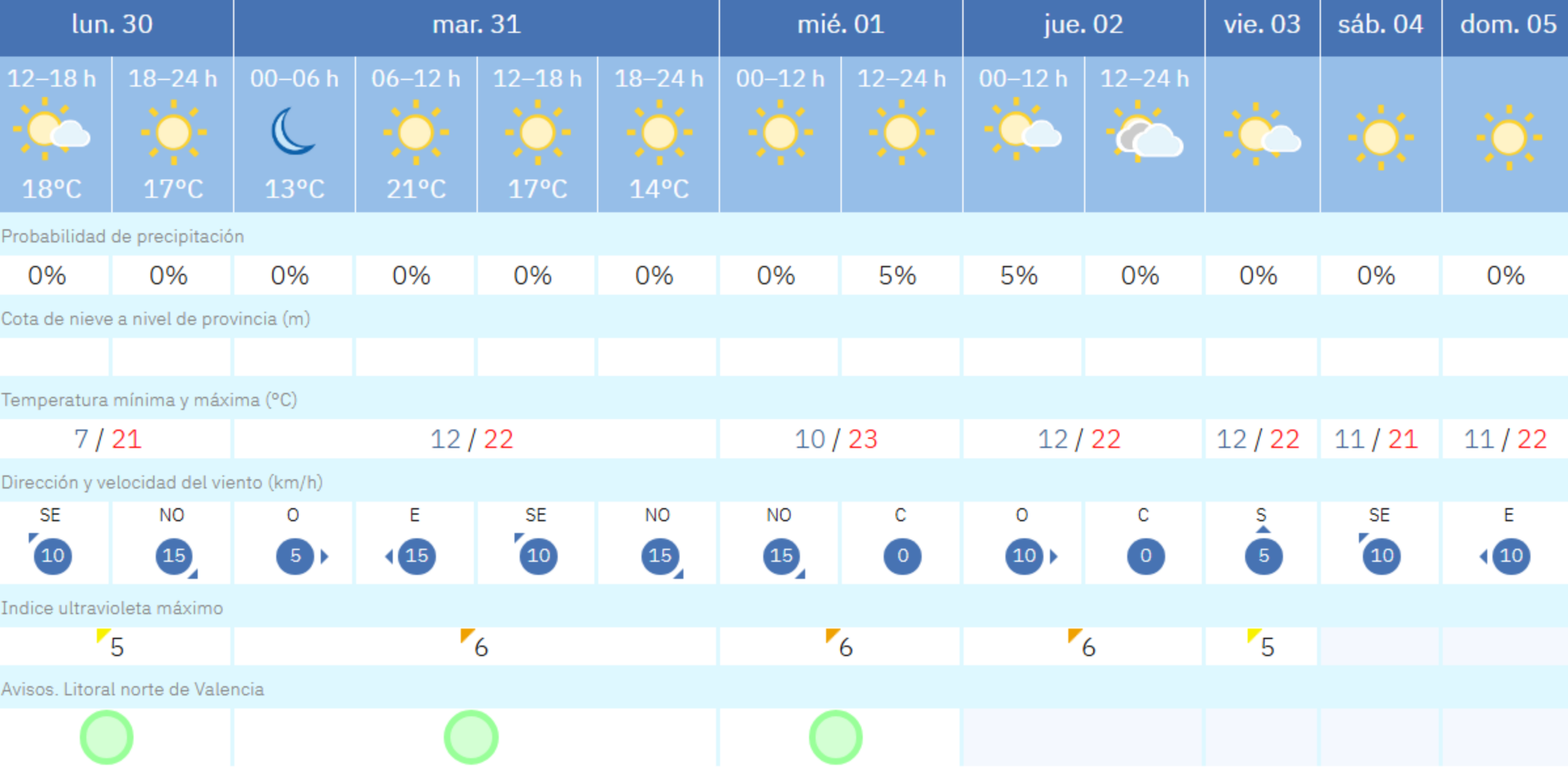 El cambio más significativo llegará de cara al tramo central y final de la Semana Santa. El jueves se espera un cielo poco nuboso, aumentando a intervalos nubosos durante las horas centrales del día. Temperaturas mínimas en ligero ascenso o sin cambios; máximas en ligero descenso o sin cambios. Viento del norte y noroeste, flojo a moderado en la mitad sur y moderado en el resto, con rachas muy fuertes en Castellón.
