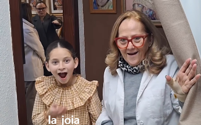 La Fallera Mayor Infantil de Valencia, Marta Mercader, reacciona con emoción y sorpresa al ver el espolín de su exaltación. Esta tarde tendrá lugar uno de los actos más importantes de su reinado en el Palau de la Música.