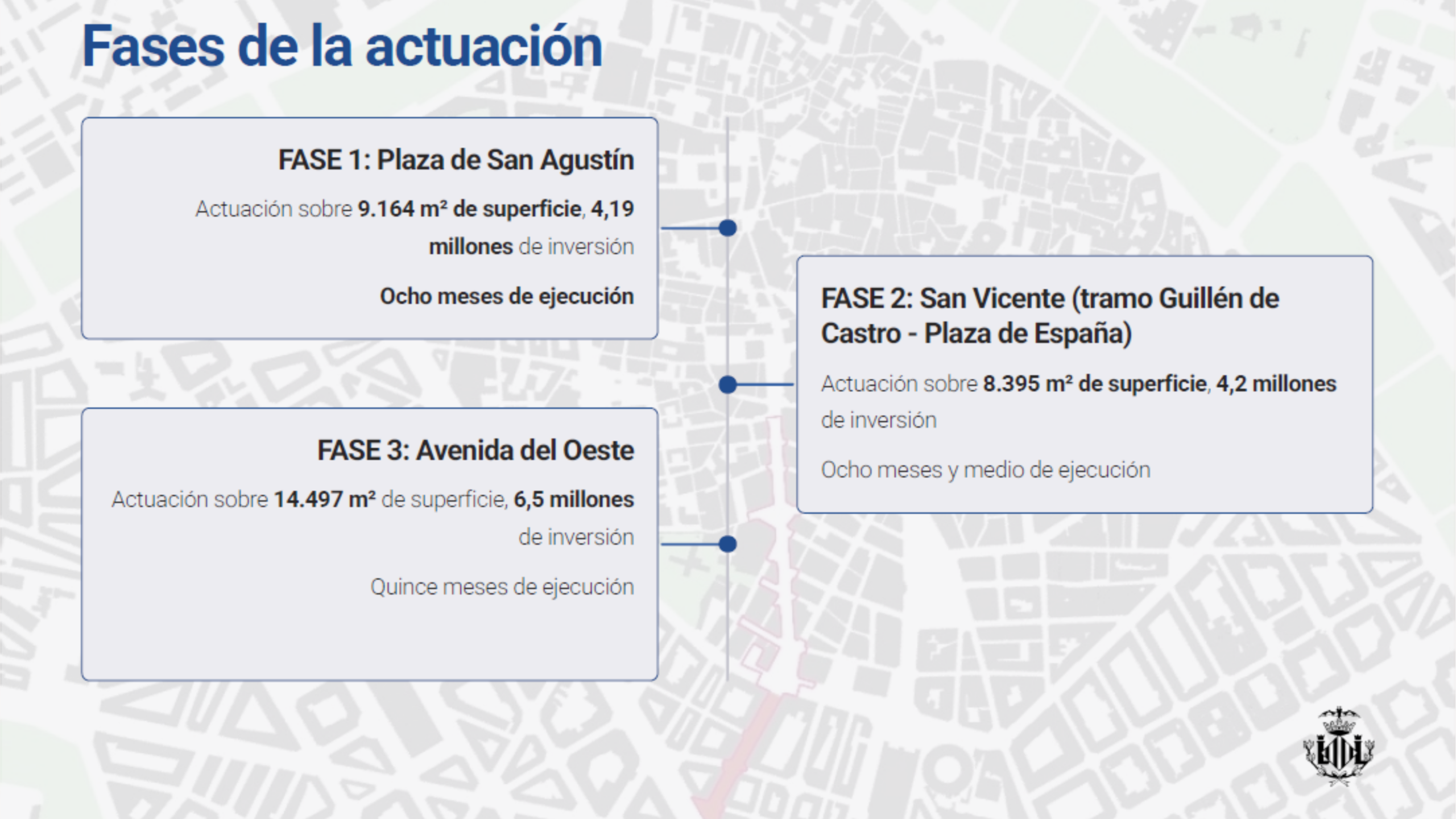 La fase 1 (San Agustín) contará con un presupuesto de 4.195.171,95 euros; la fase 2 (San Vicente) dispondrá de una inversión de 4.202.484,94 euros, mientras que a la fase 3 (avenida del Oeste) se ha reservado una partida económica de 6.551.173,97 euros. El proyecto de remodelación urbana se ejecutará en un ámbito de más de 30.000 m2.