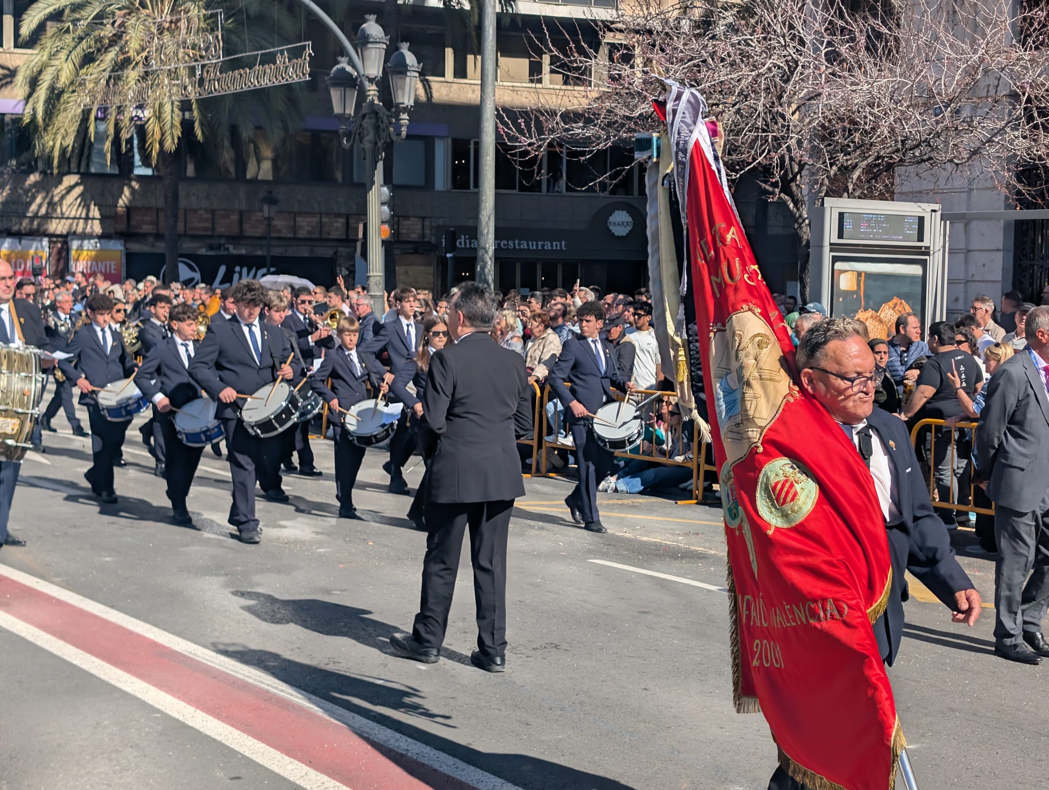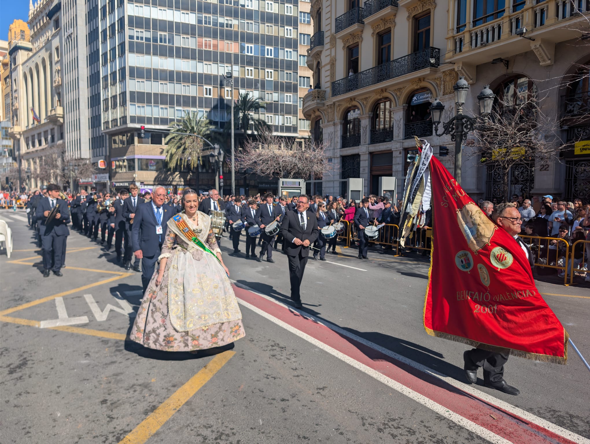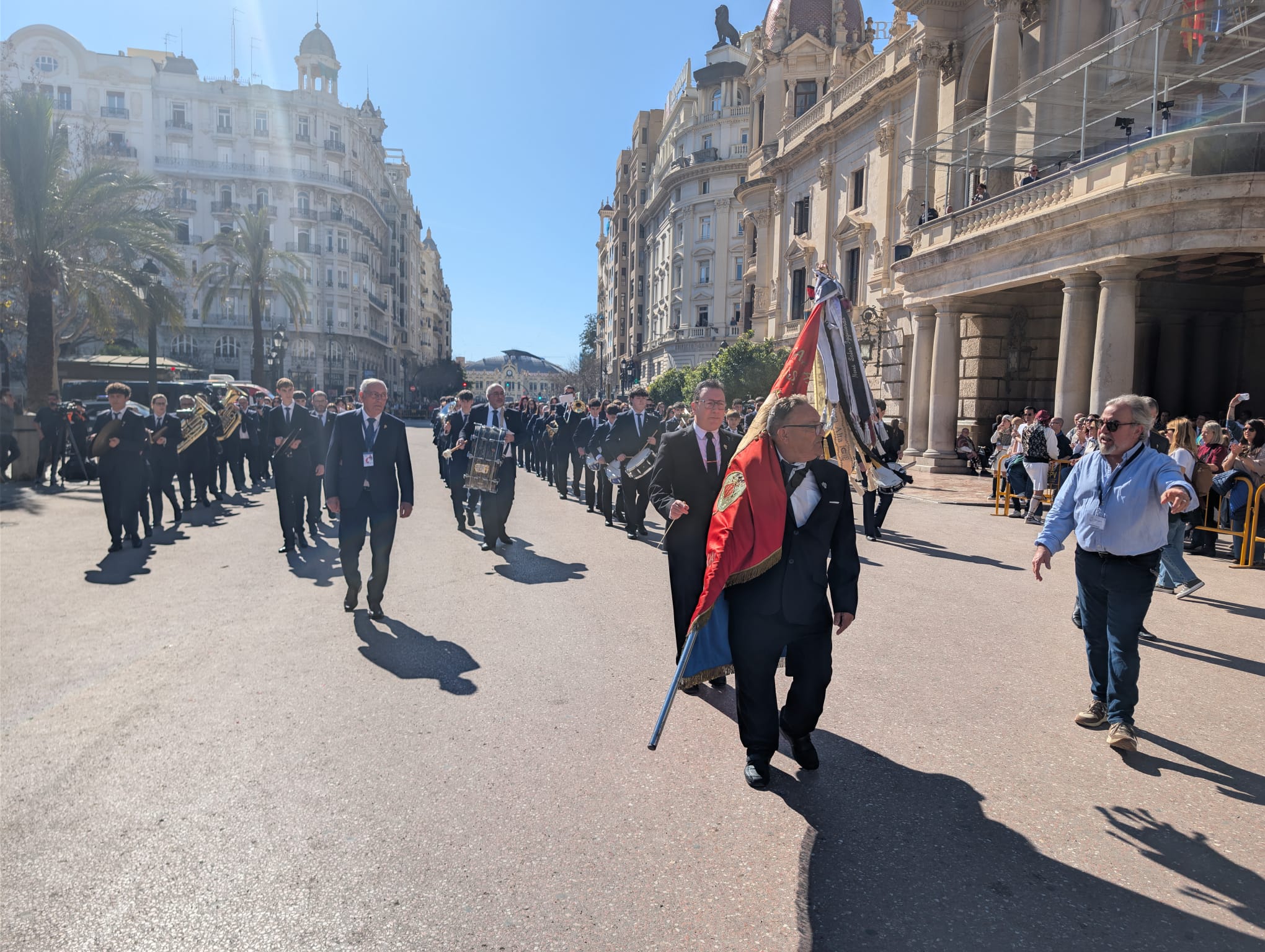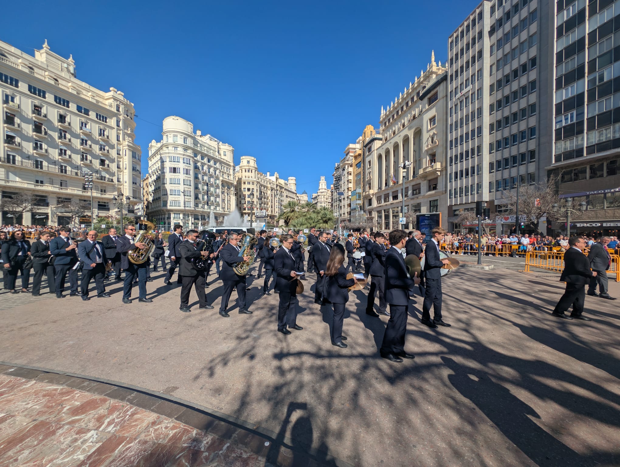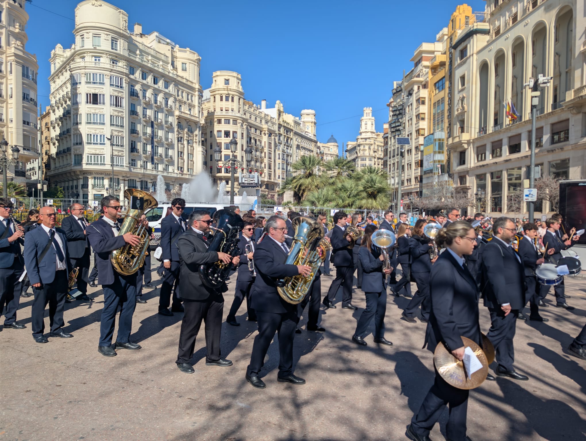 Finalmente, todas las agrupaciones musicales han interpretado al unísono el pasodoble ‘El Fallero’. Al finalizar la entrada de bandas, a las 14.00 horas, se disparará una mascletà a cargo de Pirotecnia Valenciana.