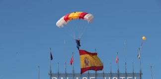 Una paracaidista valenciana despliega la bandera en el desfile del 12...