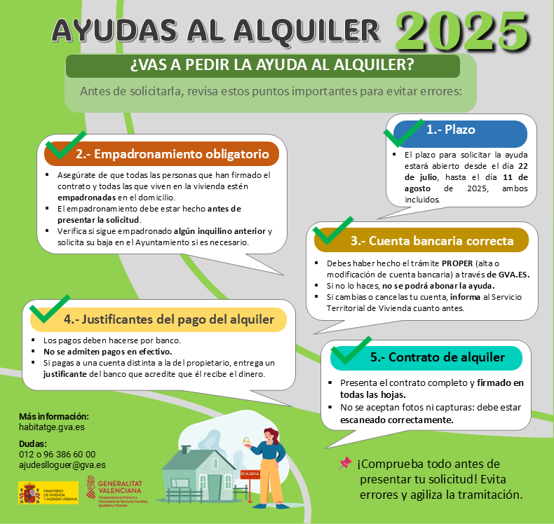 Otro requisito esencial es haber dado de alta o actualizado la cuenta bancaria mediante el sistema PROPER a través del portal de la Generalitat (GVA.ES). En caso contrario, no podrá abonarse la ayuda, y si se cambia o cancela la cuenta, es necesario informar de inmediato al Servicio Territorial de Vivienda.