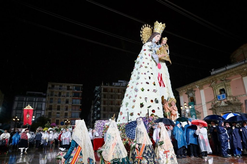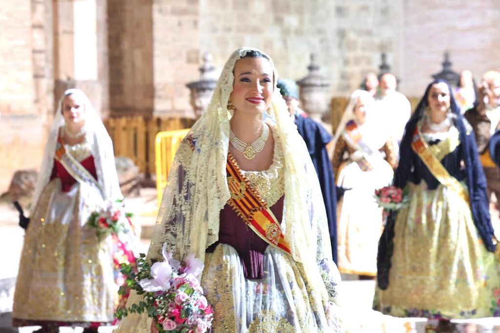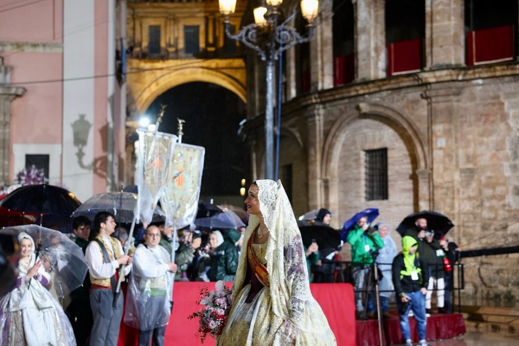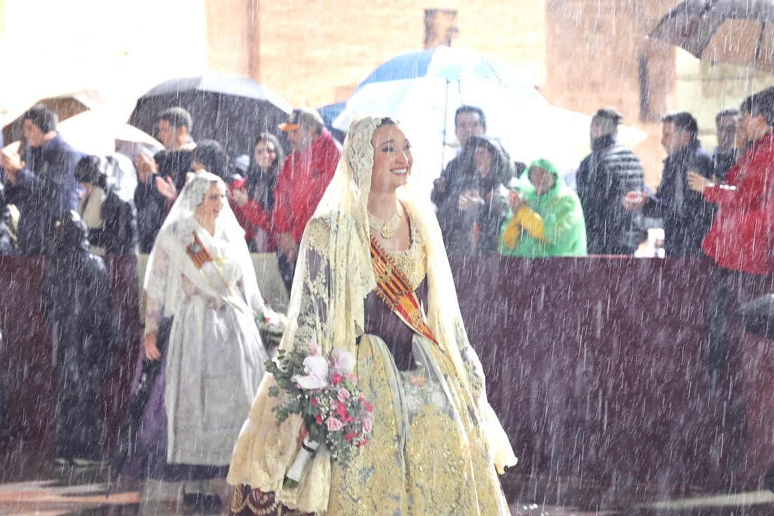 Berta Peiró desfila en una Ofrenda bajo la lluvia. Por segundo día consecutivo, las calles de Valencia se llenan de emoción y agradecimiento con el homenaje a la Virgen de los Desamparados. Más de 120.000 falleras y falleros terminarán de vestir el manto floral de la Geperudeta con ramos y centros florales, un manto cuyo diseño ya comienza a vislumbrarse después del primer día de la Ofrenda.