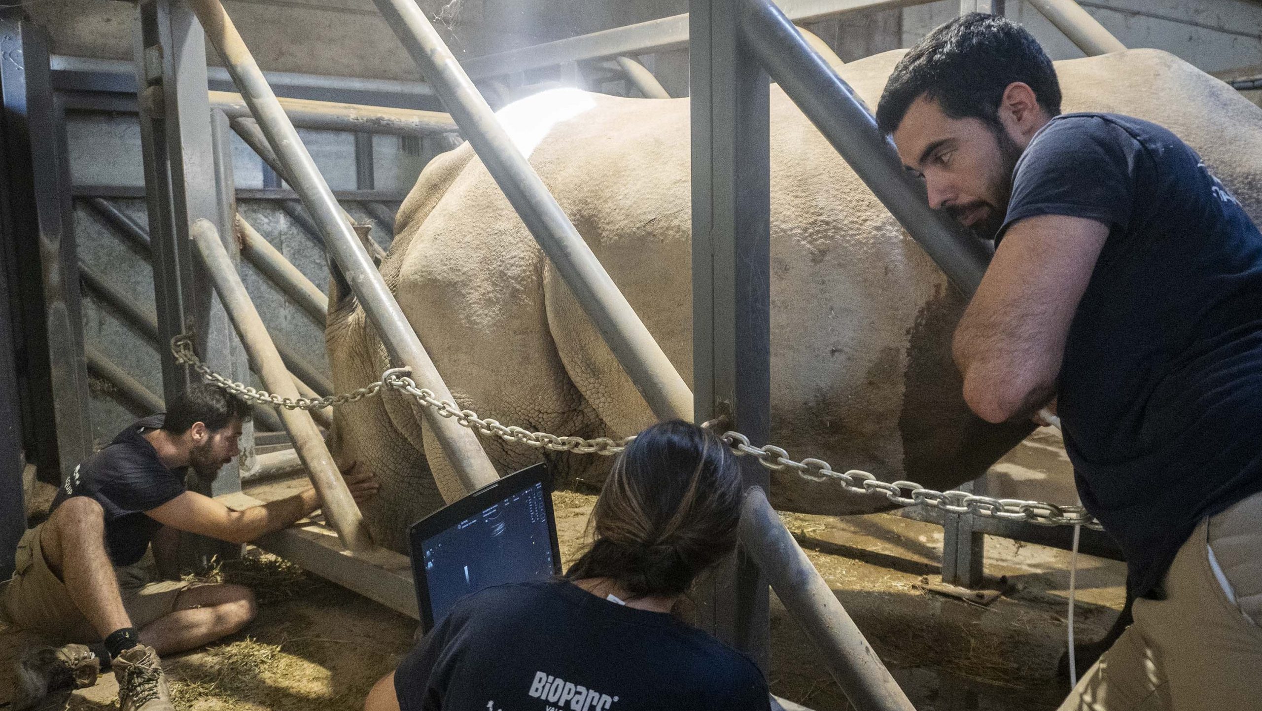 El seguimiento veterinario de la rinoceronta Kwanza al llegar al día 490 de gestación evidencia un parto inminente. El protocolo especial incluye la vigilancia no invasiva durante las 24h mediante un sistema de cámaras instaladas en distintos puntos, lo que permite percatarse de cualquier modificación en su comportamiento o novedad en su actividad.