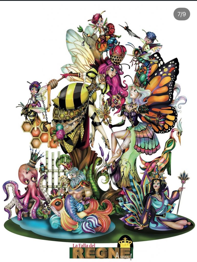 Sergio Musoles planta en Reino de Valencia-D. de Calabria con un presupuesto de 107.000 euros. En el centro se verá a la abeja reina y la mariposa monarca. El lema es ‘La falla del Regne… animal’. Hay animales que hacen de animales y seres humanos que hacen animaladas. Todos ellos relacionados con la política, medio ambiente, el deporte y en el mundo fallero.