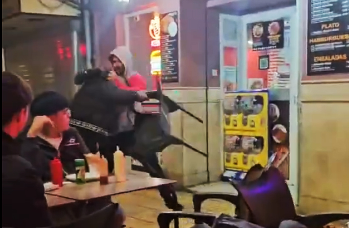 Brutal pelea de dos jóvenes a las puertas de un Kebap de Xàtiva situado en la Albereda Jaume I. Una arteria principal donde se concentra la vida social del municipio. Como puede verse la gente de la terraza se aparta de la trifulca y el dueño del local tiene que salir para poner orden.