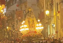 El cadafal con la imagen de la Virgen de los Desamparados, restaurado por el Ayuntamiento de Valencia, a cargo de los artistas Ceballos y Sanabria, luce ya en la plaza de la Mare de Déu donde ha sido instalado para acoger la Ofrenda de flores a la Mare de Déu con motivo de las Fallas.
