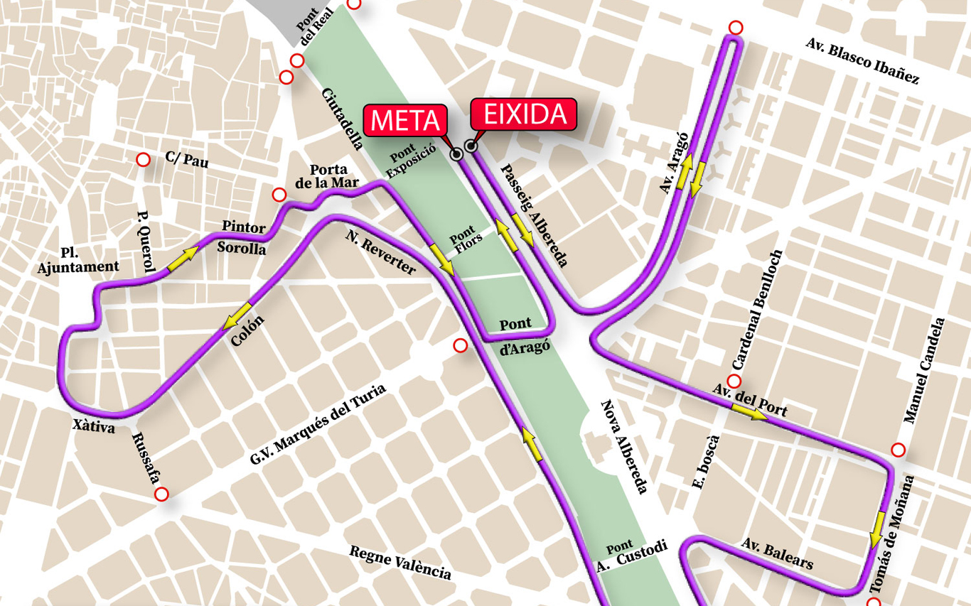 El itinerario de la carrera es el siguiente: paseo de l’Albereda, plaza Saragossa, avenida de Aragó (en contradirección al sentido del tráfico motorizado), plaza del Cardenal Vicent Enrique i Tarancón para volver por la avenida de Aragó sentido plaza Saragossa, avenida del Port, calle del Pare Tomàs de Montañana sentido avenida Balears, rotonda con Eduard Boscà, Albereda, avenida de França, plaza de Europa, Albereda de nuevo hasta el puente del Regne, Alcalde Reig, Jacinto Benavente, plaza de Amèrica, Navarro Reverter, Porta de la Mar, Colón, Xàtiva, plaza de l’Ajuntament, Barques, Pintor Sorolla, calle Palau de Justícia, calle del Justícia, puente de Aragó y Albereda hasta la meta.