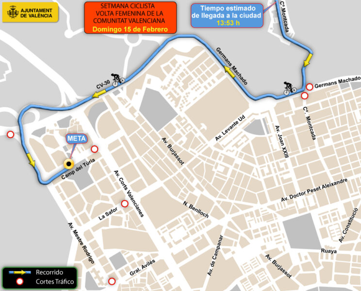 La mayor afectación se dará en esta última, dado que la Avenida Campo de Turia es el lugar designado para la meta. Entre Cortes Valencianas y Mestre Rodrigo, desde las 6:30 horas hasta las 20:30 horas, quedará cortado el acceso a vehículos. No obstante, se abrirá un carril para que los vecinos puedan salir por Beniferri.