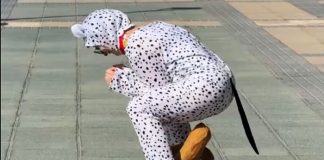 Una joven disfrazada de dálmata simula defecar en una ridícula campaña
