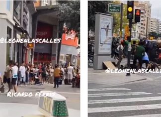 Discusión entre una multitud y una máquina de limpieza junto a...