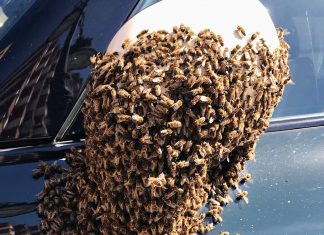 Retiran un enjambre de abejas de un espejo retrovisor en una...