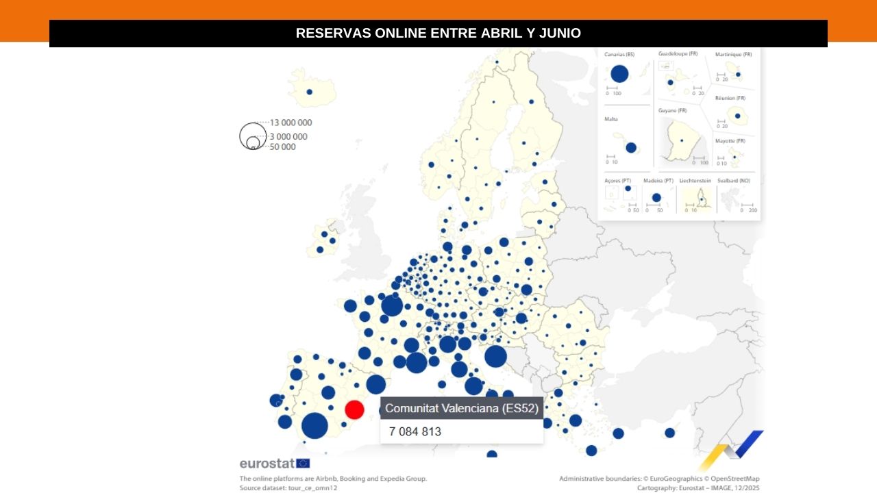 La Comunitat Valenciana se ha consolidado como uno de los principales destinos europeos del alquiler turístico de corta estancia, por encima de regiones como la Toscana (Florencia) o Lazio (Roma). Según datos de Eurostat, el territorio valenciano figura entre las diez regiones de la Unión Europea con mayor número de pernoctaciones reservadas a través de plataformas online durante el verano de 2025, con cerca de 7 millones de noches contabilizadas.