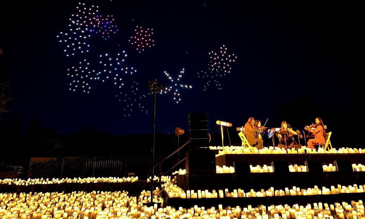 Entonces el silencio total se rompe con el cuarteto de cuerdas y, en vez de con pirotecnia como suele ser costumbre, la oscuridad del cielo dará paso a los 1.000 drones. Un millar de estos aparatos surcarán los cielos en una estudiada coreografía para dejar su firma en la noche con sus luces.