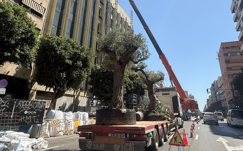 Cortan dos carriles de la avenida del Puerto para subir dos olivos centenarios dentro de un hotel. La Policía Local ha estado ayudando para que los operarios con su camión pudieran hacer su trabajo. Afortunadamente, al ser domingo, no había mucho congestión de tráfico. La avenida del Puerto es uno de las carreteras de acceso a la Marina Sur de Valencia. También hacia los poblados marítimos.