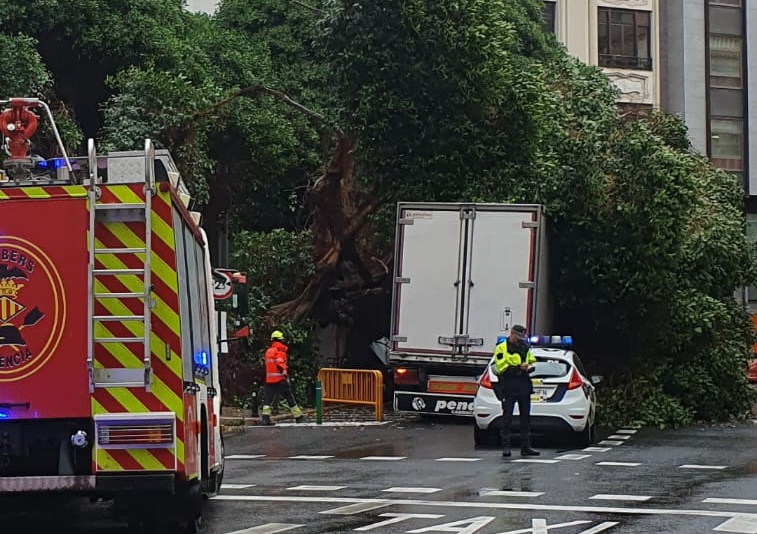 La Policía Local ha cortado la calle Pintor Sorolla para talar árboles en mal estado, un ficus que se ha desplomado en la calle Universidad por la lluvia, en el cruce con la calle Comedias. Durante las últimas horas, los bomberos no paran de tener servicios de caídas de ramas.