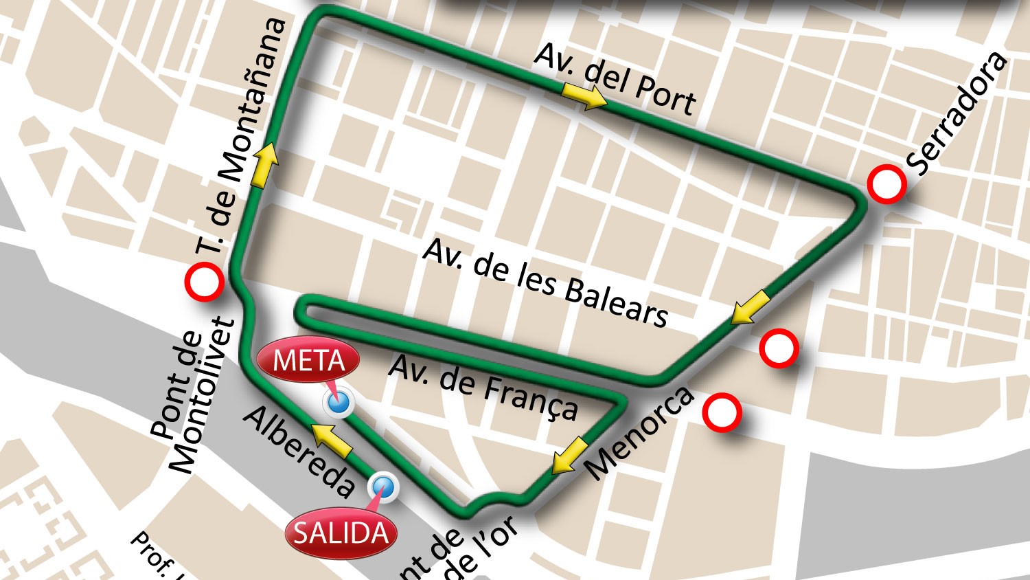 El evento comenzará a las 9:00 h con salida desde el Paseo de la Alameda. Recorrerá un circuito de 5 kilómetros que incluye vías de gran tránsito como Pare Tomás de Montañana, avenida del Puerto, calle Eivissa, calle Menorca y avenida Francia. Esta última se habilitará parcialmente para permitir el tráfico procedente de las calles Luís García-Berlanga Martí y Alfred Toran i Olmos.