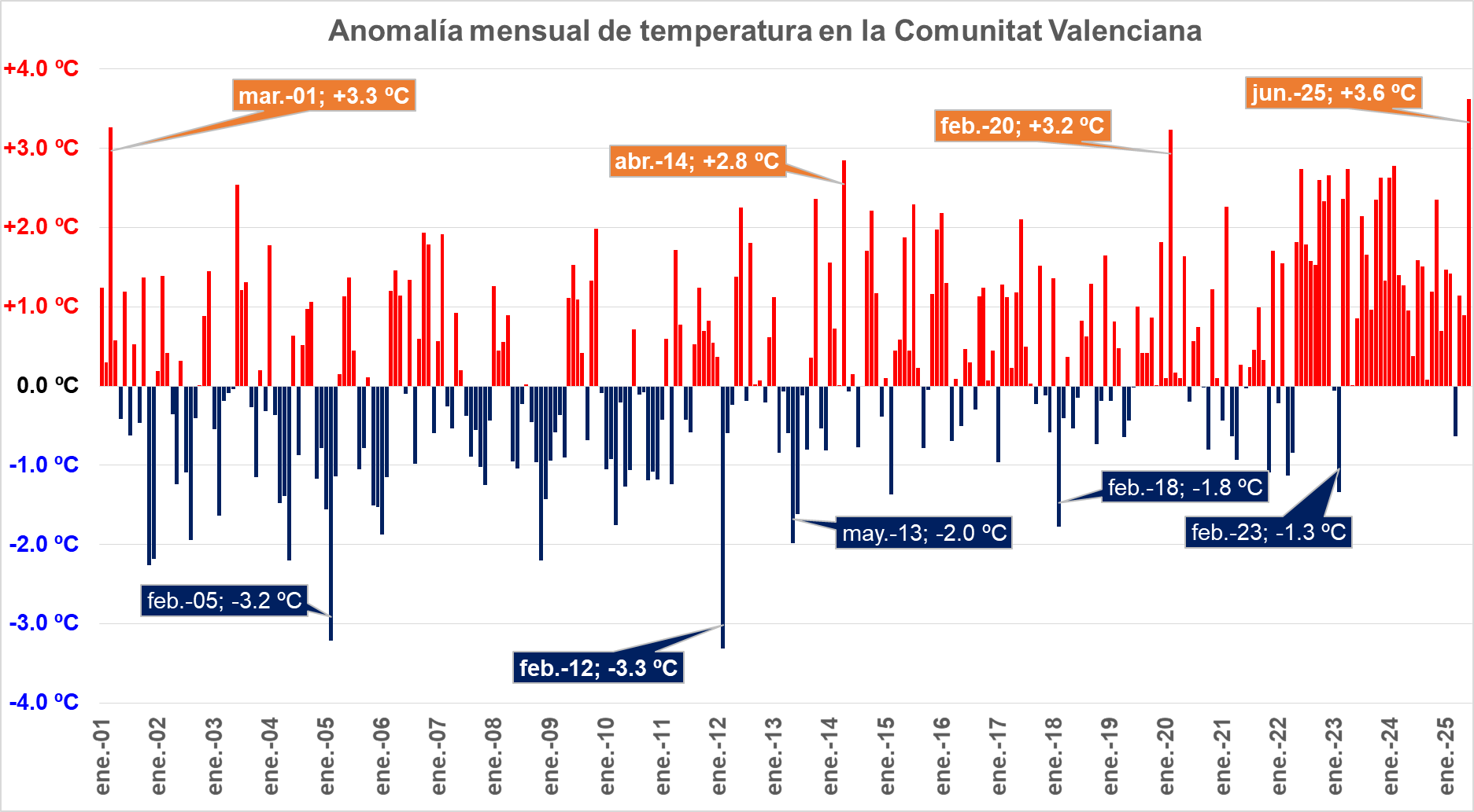 El mes de junio de 2025 pasará a la historia como el más cálido jamás registrado en la Comunitat Valenciana, según los datos oficiales de la Agencia Estatal de Meteorología (AEMET). Con una anomalía térmica de +3,6 ºC respecto a la media climática, este junio no solo ha batido récords mensuales, sino que se ha posicionado como el mes más anómalo en temperatura de toda la serie histórica, por encima incluso de los históricos febreros de 1990 (+3,4 ºC) o marzo de 2001 (+3,3 ºC).