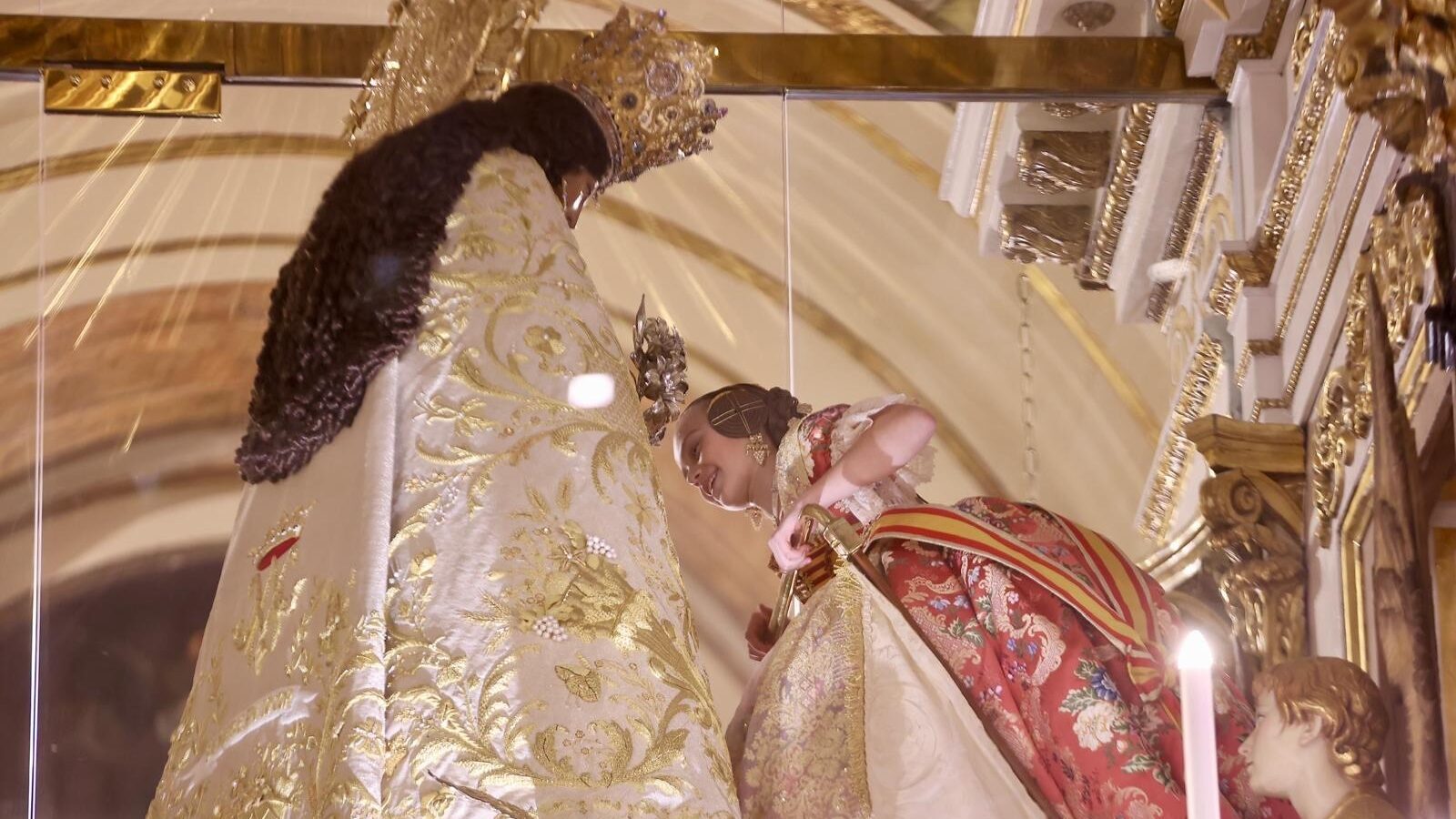 Tras la Exaltación de la Fallera Mayor Infantil de València, las Falleras Mayores y sus Cortes de Honor se trasladan a la Basílica de la Virgen de los Desamparados, donde realizan una ofrenda. En este momento tan íntimo, las máximas representantes pueden subir al camarín y besar el manto de la Virgen.