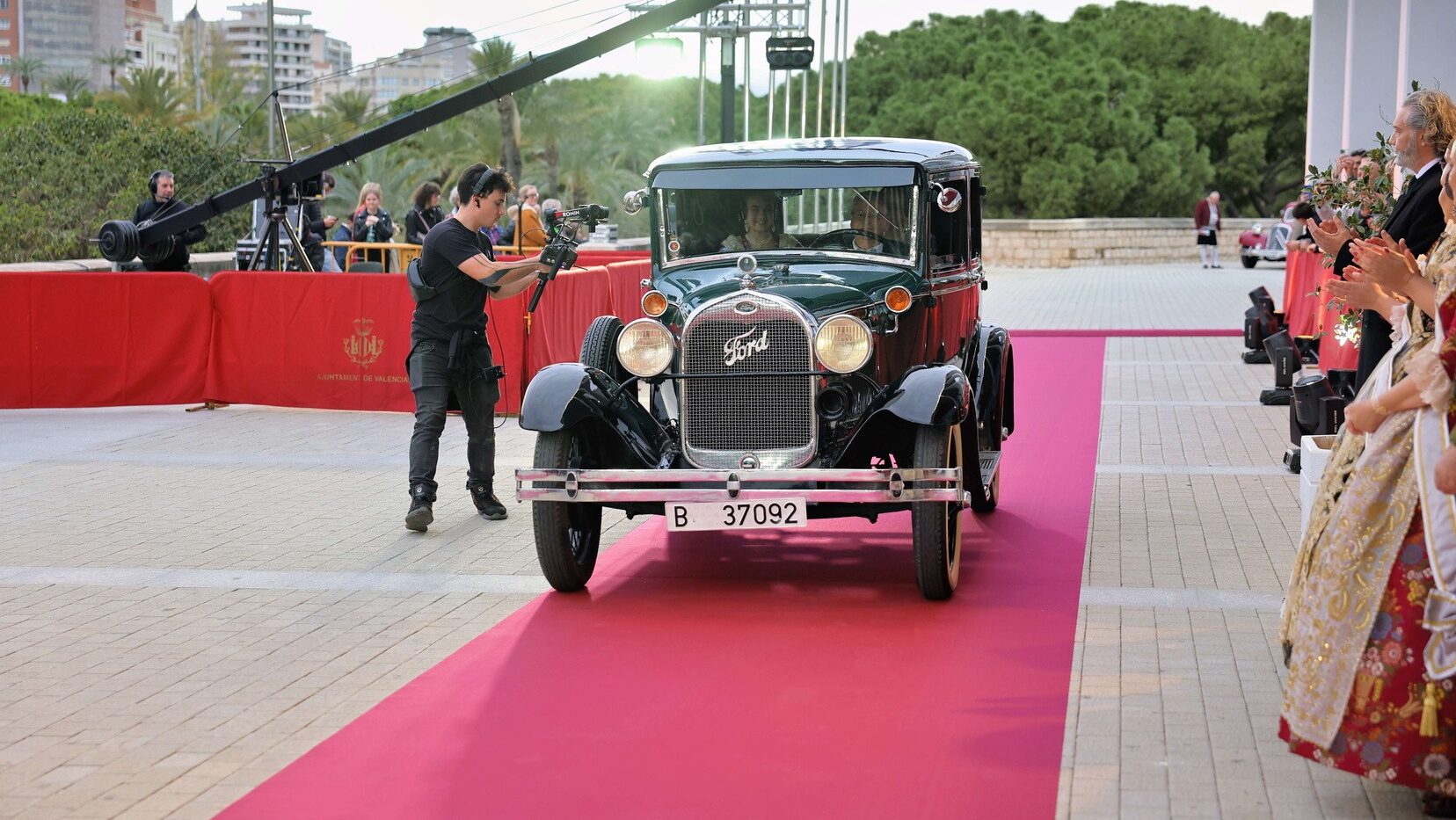 Las Falleras Mayores de València y sus Cortes de Honor llegan a la Exaltación en coches antiguos, que las trasladan desde el Ayuntamiento de València hasta el Palau de la Música.