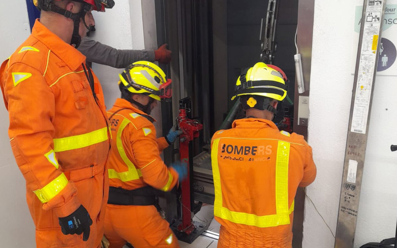 Los bomberos del Consorcio de Valencia rescatan a cuatro personas del ascensor de un centro comercial de Massalfassar. Hasta al lugar se han desplazo agentes del cuartel de Pobla de Farnals y Sagunt. Estos han elevado con un aparato el acceso y han estabilizado con puntales para realizar la extracción de forma segura.