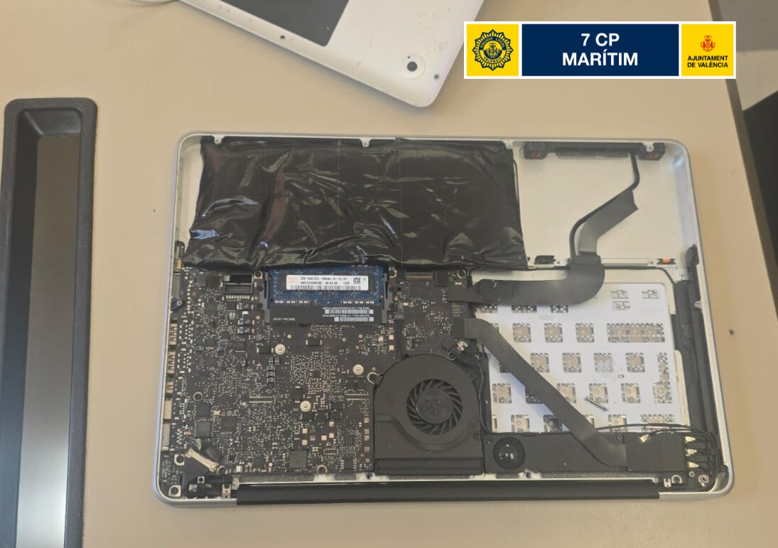 La Policía Local de Valencia detiene en el Cabanyal a un hombre que escondía 11 gramos de cocaína dentro de un ordenador. Dos patrullas de la Comisaría de Proximidad del Marítimo, que estaban haciendo un control de Vehículos de Movilidad Personal y bicicletas en el Puente de Astilleros, junto a la Playa del Cabañal, han detenido a un hombre que llevaba 100 gramos de cocaína.