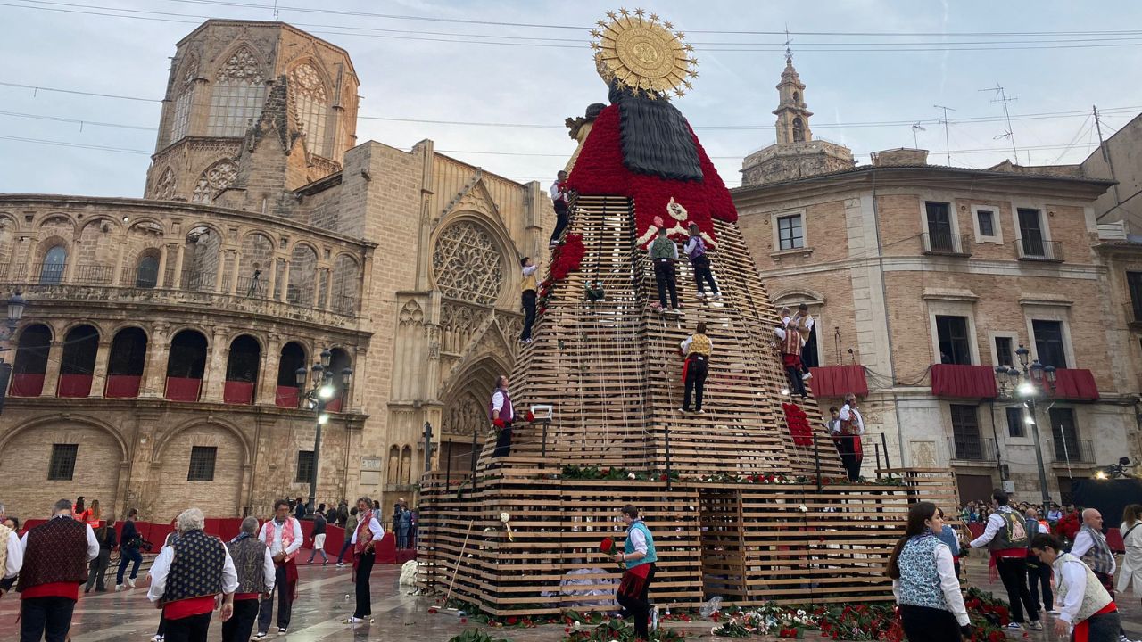 Durante dos jornadas, las comisiones recorren el centro de València hasta la Plaza de la Virgen para entregar sus ramos a la patrona, conocida popularmente como la Geperudeta. Con esas flores los vestidores de la Virgen, un grupo de voluntarios especializados, suben a la estructura de madera para encajar cada ramo, confeccionando un diseño secreto del manto que se va formando poco a poco.