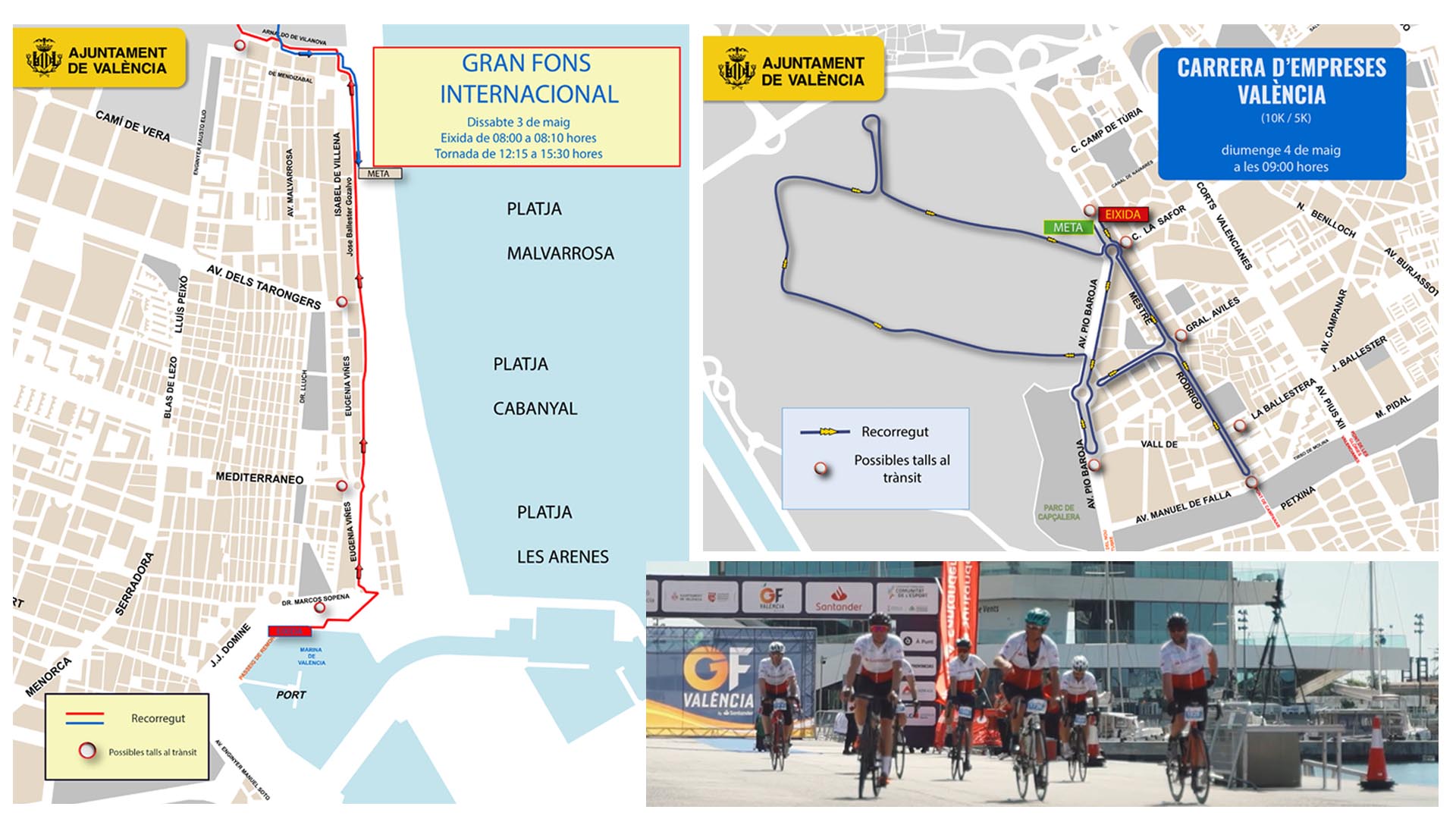 Este próximo domingo, 4 de mayo, el distrito de Campanar acoge la XII Carrera de Empresas Valencianas, de 9 a 10:40 horas, en dos circuitos: un recorrido de 5 kilómetros y otro de 10. El sábado, por otro lado, Poblats Marítims serán la sede de la salida y la meta de la marcha ciclista Gran Fondo Internacional, en la vigésima edición.