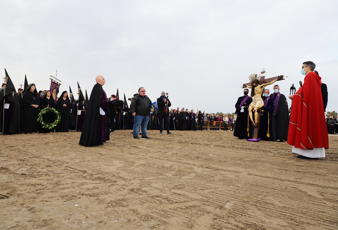 Dos cofradías de la Semana Santa Marinera recuerdan a orillas de la playa a los fallecidos en el mar. Este Viernes Santo celebra con sus imágenes titulares a orillas de la playa en el barrio valenciano del Cabanyal para rezar por los pescadores y marineros fallecidos en el mar y también por todos los náufragos.