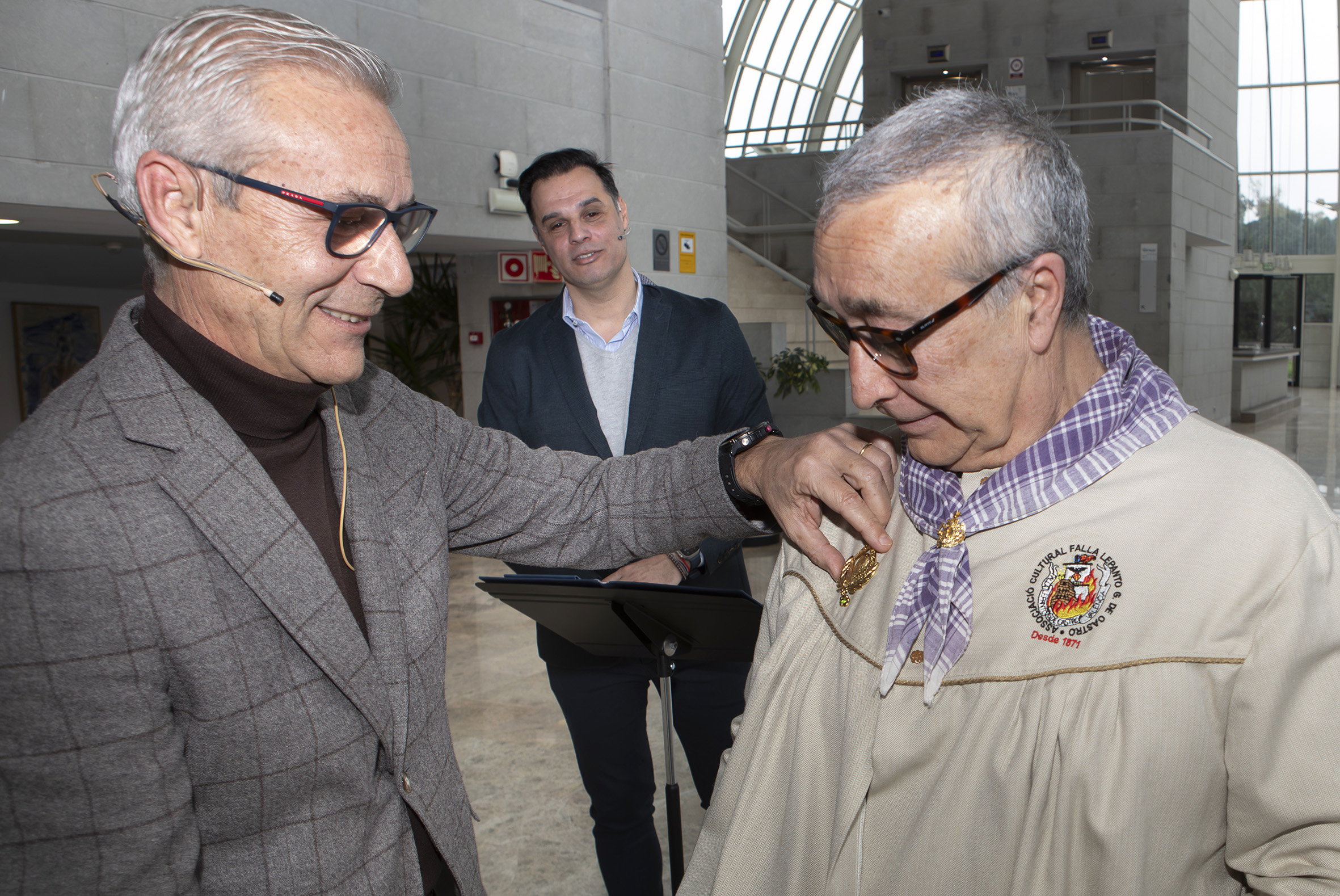 Durante la rueda de prensa, que ha tenido lugar esta mañana en el Palau de la Música, el presidente de Junta Central Fallera, Santiago Ballester, ha sido el encargado de imponer esta insignia simbólica al Delegado Sostenible de la falla Lepanto-Guillem de Castro, Pepo Caballero, en representación de las comisiones que ya cuentan con este cargo. Ecovidrio entregará dicha insignia a todos los delegados sostenibles que vayan surgiendo en las comisiones falleras.