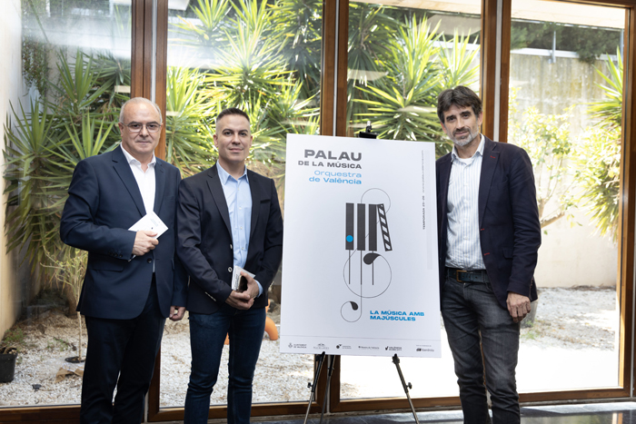 El Palau de la Música de Valencia reivindica la música en mayúsculas con 40 conciertos de abono, más 6 extraordinarios. El concejal de Cultura, José Luís Moreno, el director del Palau, Vicent Llimerà y la subdirectora de Música, Nieves Pascual, presentan la Temporada de abono 2025/26. El violinista Renaud Capuçon y José María Sánchez-Verdú son el artista y compositor residentes, respectivamente, mientras que Paul McCreesh continuará siendo el director principal invitado.