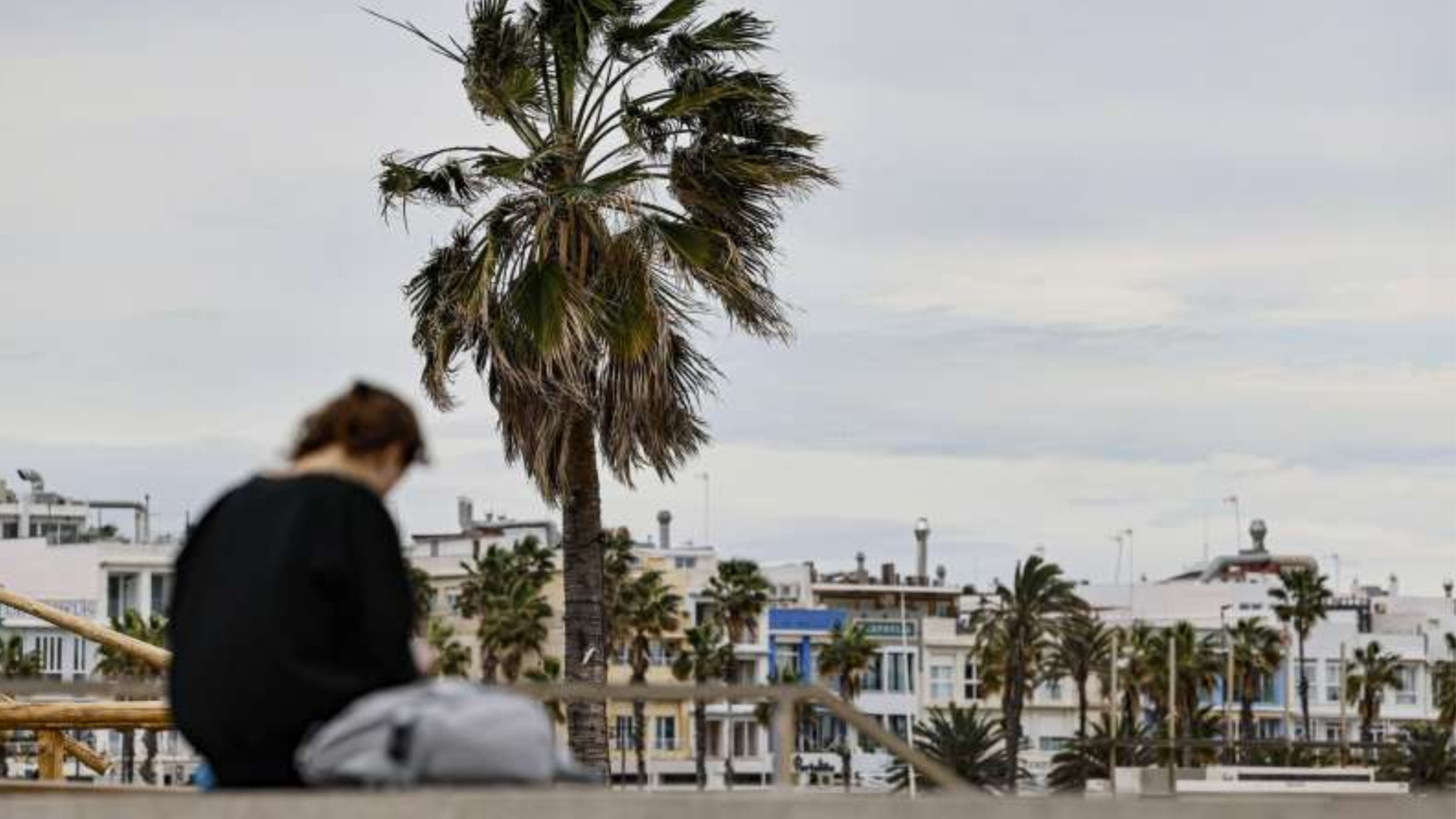 El viento azota con fuerza las palmeras del Paseo Marítimo de Valencia. / ANA ESCOBAR (EFE)