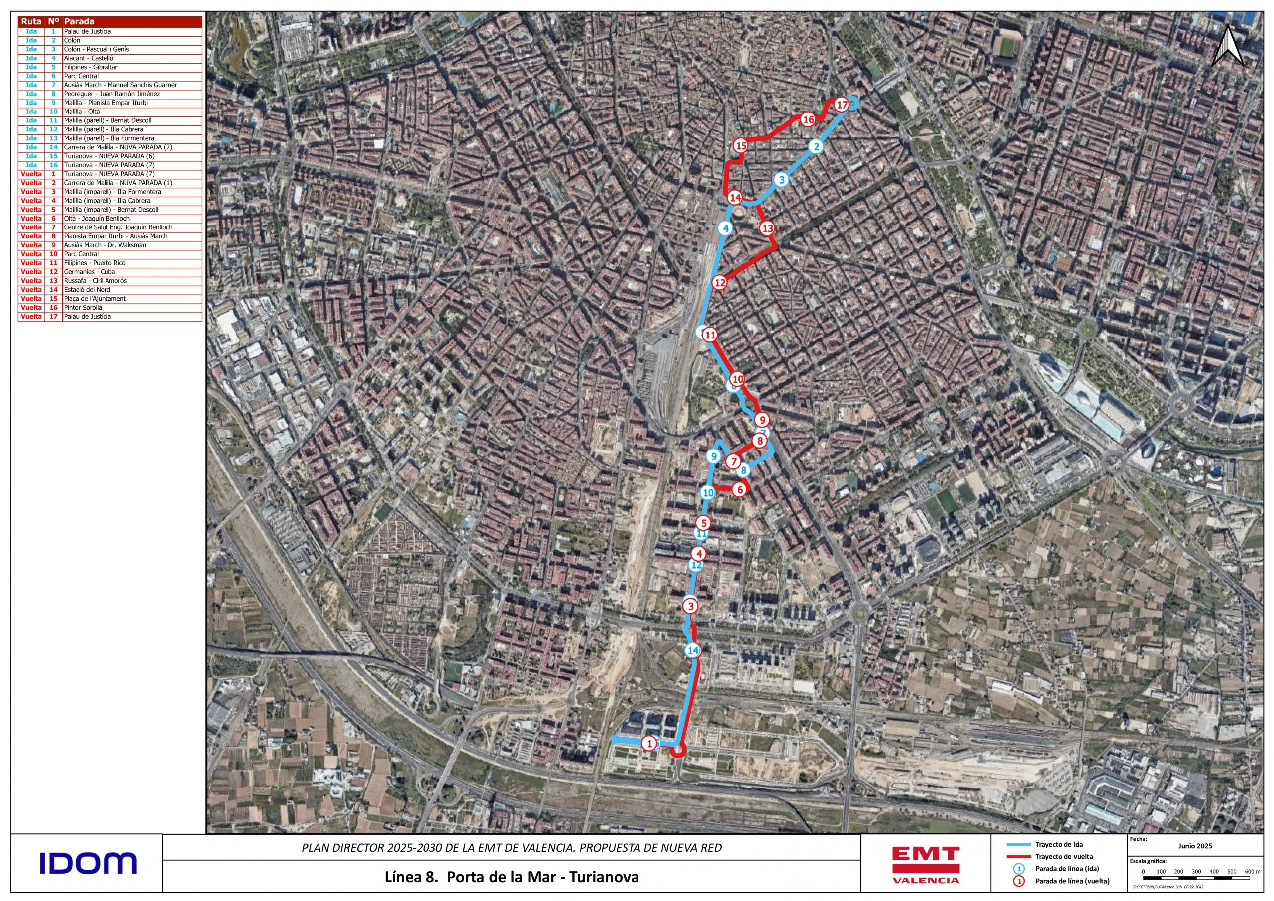 Las primeras líneas en implantarse del nuevo Plan Director que ha preparado la Empresa Municipal de Transportes (EMT) para 2025-2030 serán las que lleguen a los nuevos barrios de Turianova y Sociópolis. La primera será una prolongación de la línea 8, con paradas en la citada zona de expansión de la ciudad. Además, se habilitará otra línea que se llamará 9-S y comunicará con Sociópolis.