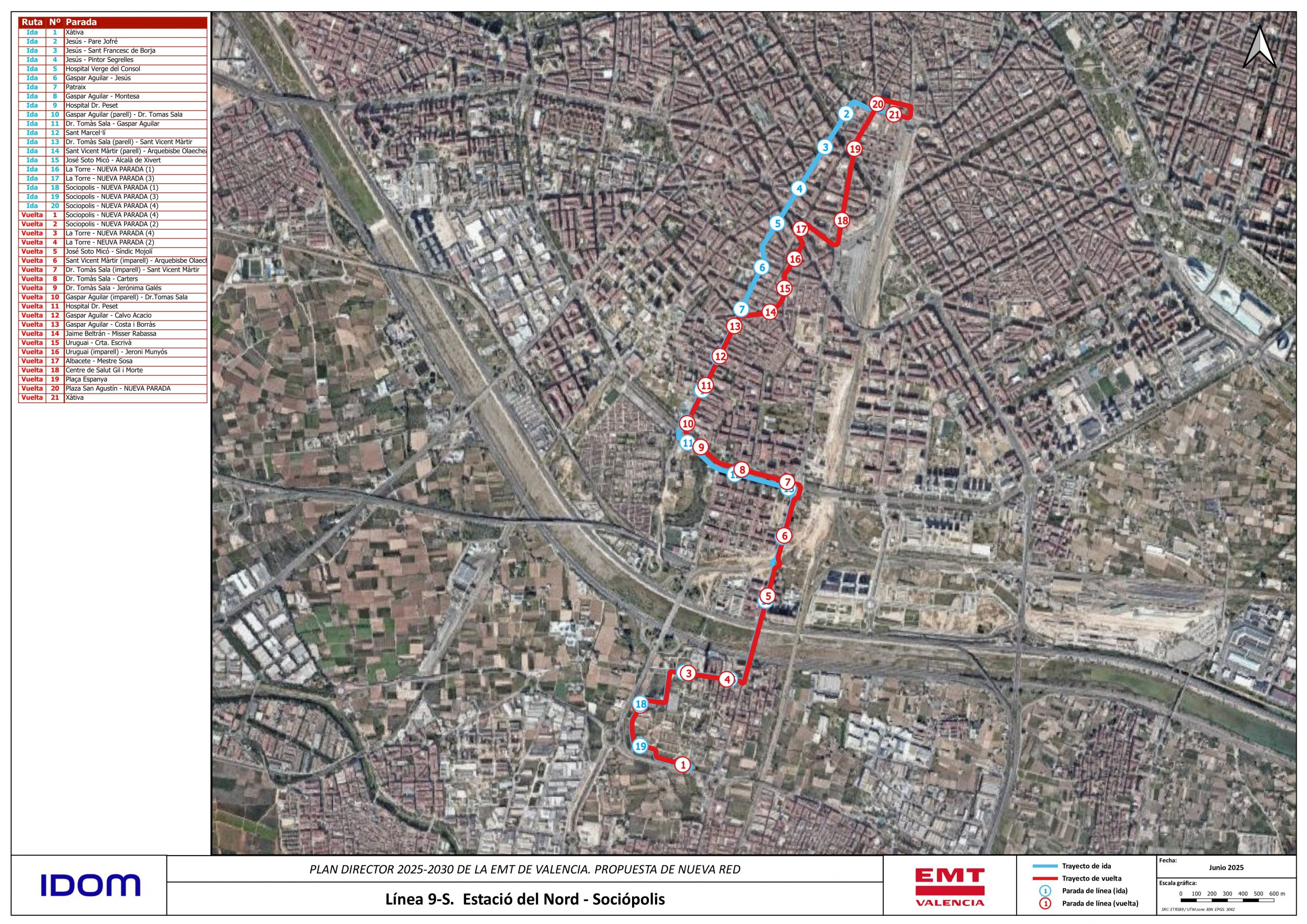 La nueva línea 9-S se concibe como una variante de la línea 9, siguiendo su mismo trazado desde la Estación del Norte hacia los barrios de Patraix, Hort de Senabre y Sant Marcel·lí. A la llegada a la Torre se bifurcará para entrar dentro de Sociópolis y dar servicio, de este modo, a todo el conjunto de residenciales que se han consolidado en los últimos años.