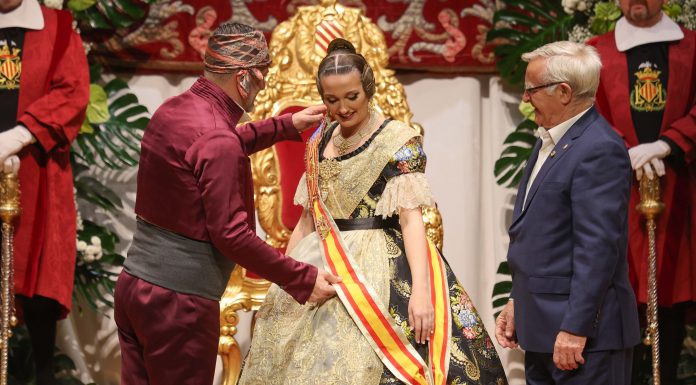 El alcalde de la ciudad, Joan Ribo, impone a Laura Mengó la banda que le acredita como Fallera Mayor de Valencia. Pero antes, emocionada...